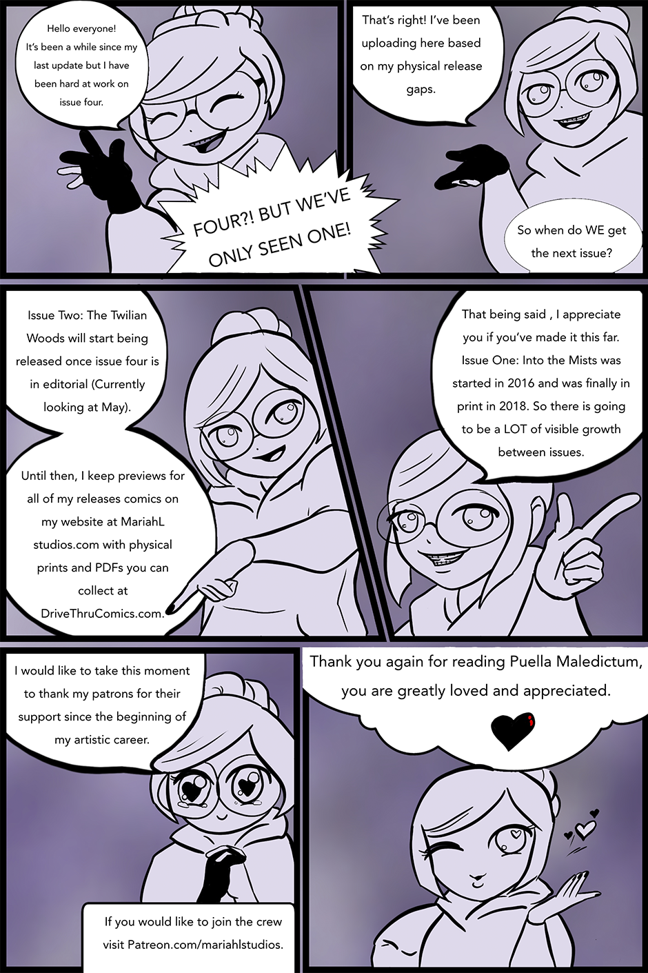 Hey all! It's been a while since I've uploaded. I don't think I've ever officially stated the game plan about how posting on Tapas was going to work so here it is now. Don't forget you can find me through pretty much every social media platform searching my name: MariahLStudios. Anyway I hope you're all having a great day and I will be (hopefully) posting more Puella Maledictum soon!