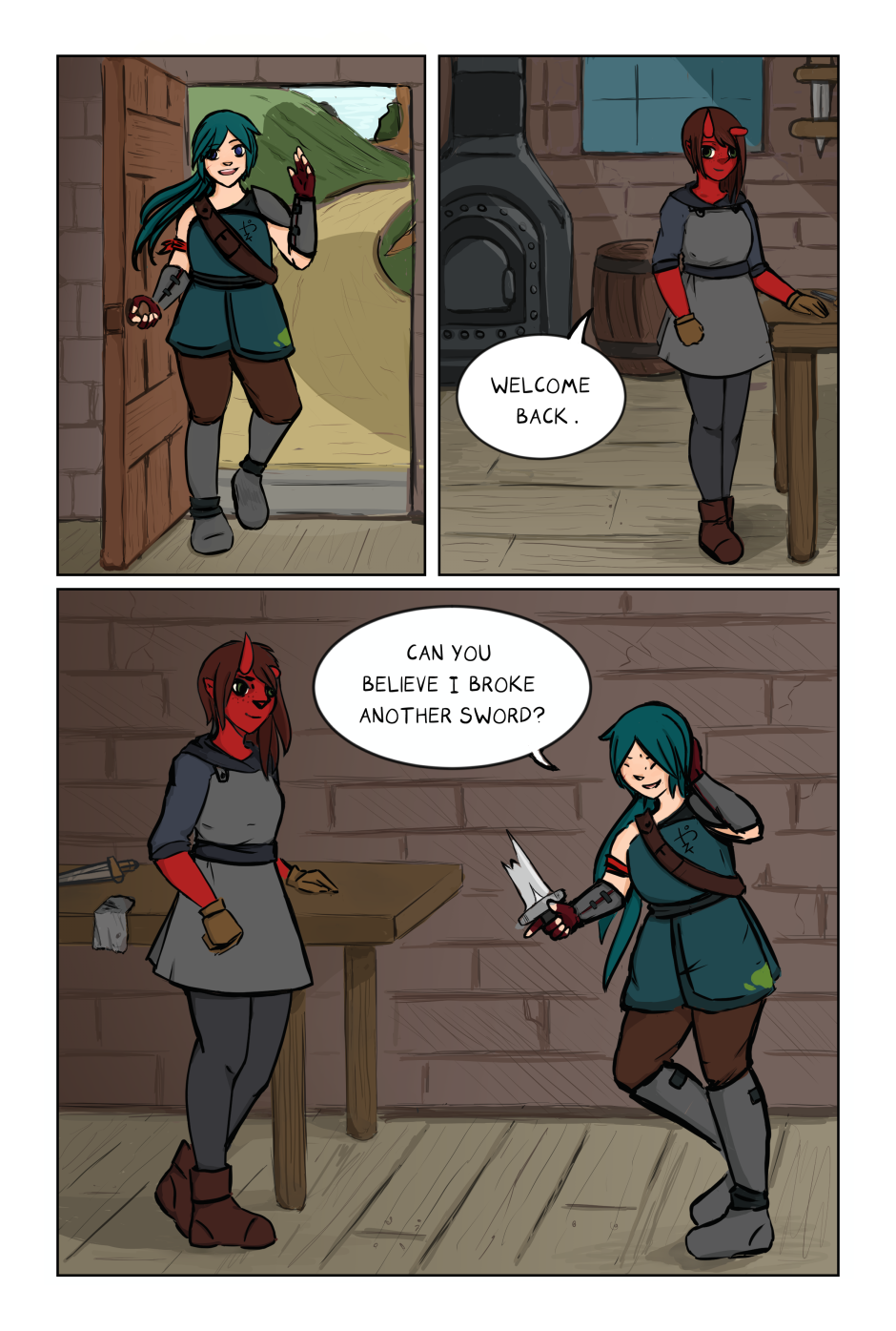 Alauna can’t do magic, despite descending from a line of healers. She turns to mercenary work instead, where her joy is found in visiting Kyrah, a local swordsmith. When Alauna stumbles to her with a fatal wound, Kyrah exposes her ability to heal in order to save her.