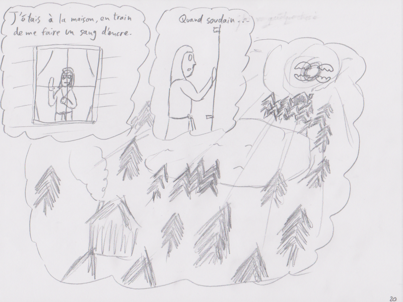 Translation: "I was at home, worrying my heart out. When suddenly..."