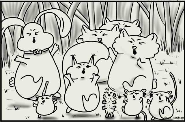 The group dashed out of the shrubbery into the opening, making a lot of noise in the hopes of the monster being intimated enough to just run away and leave them and the raspberries.