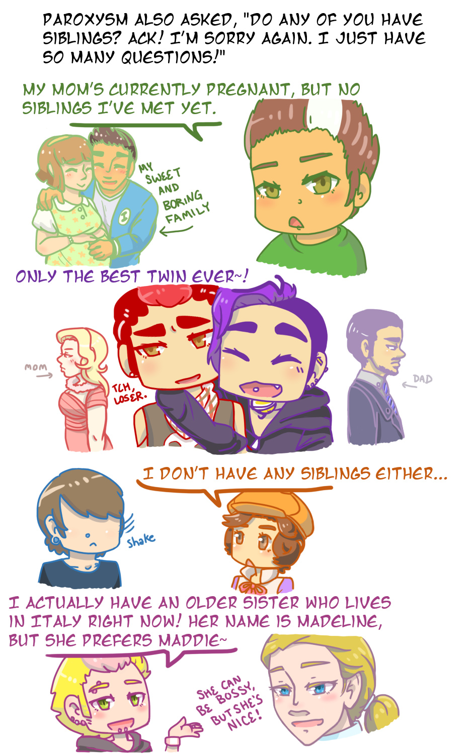 Ah, sorry for the delay on the answers! I know, this one only has one answer, but when it involves drawing so many characters, it takes a really long time. Speaking of, quite a few upcoming answers have a LOT of things to draw within them, so I think I'll stop coloring them from here on out, but I should have more prepared for next weekend~
