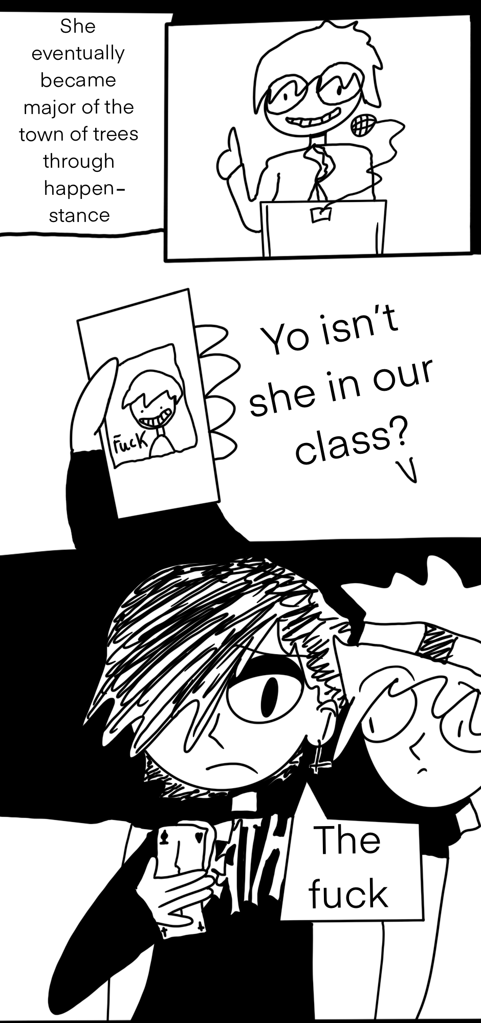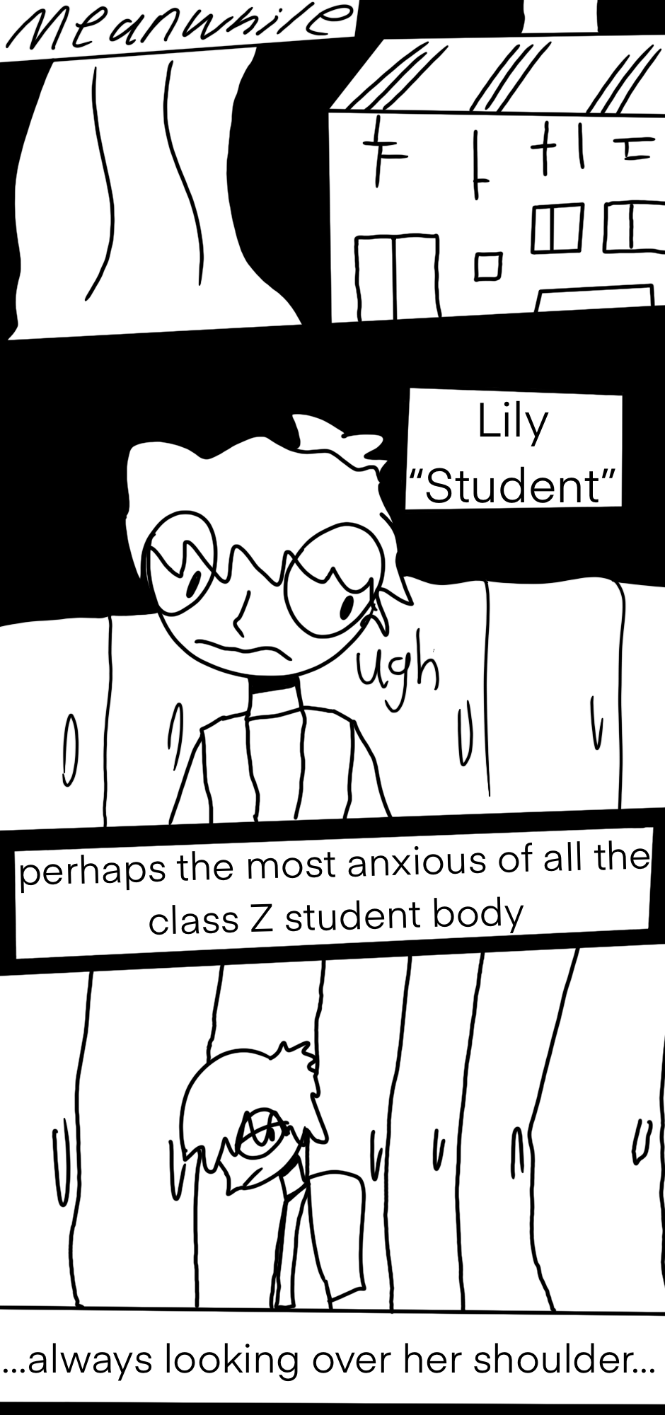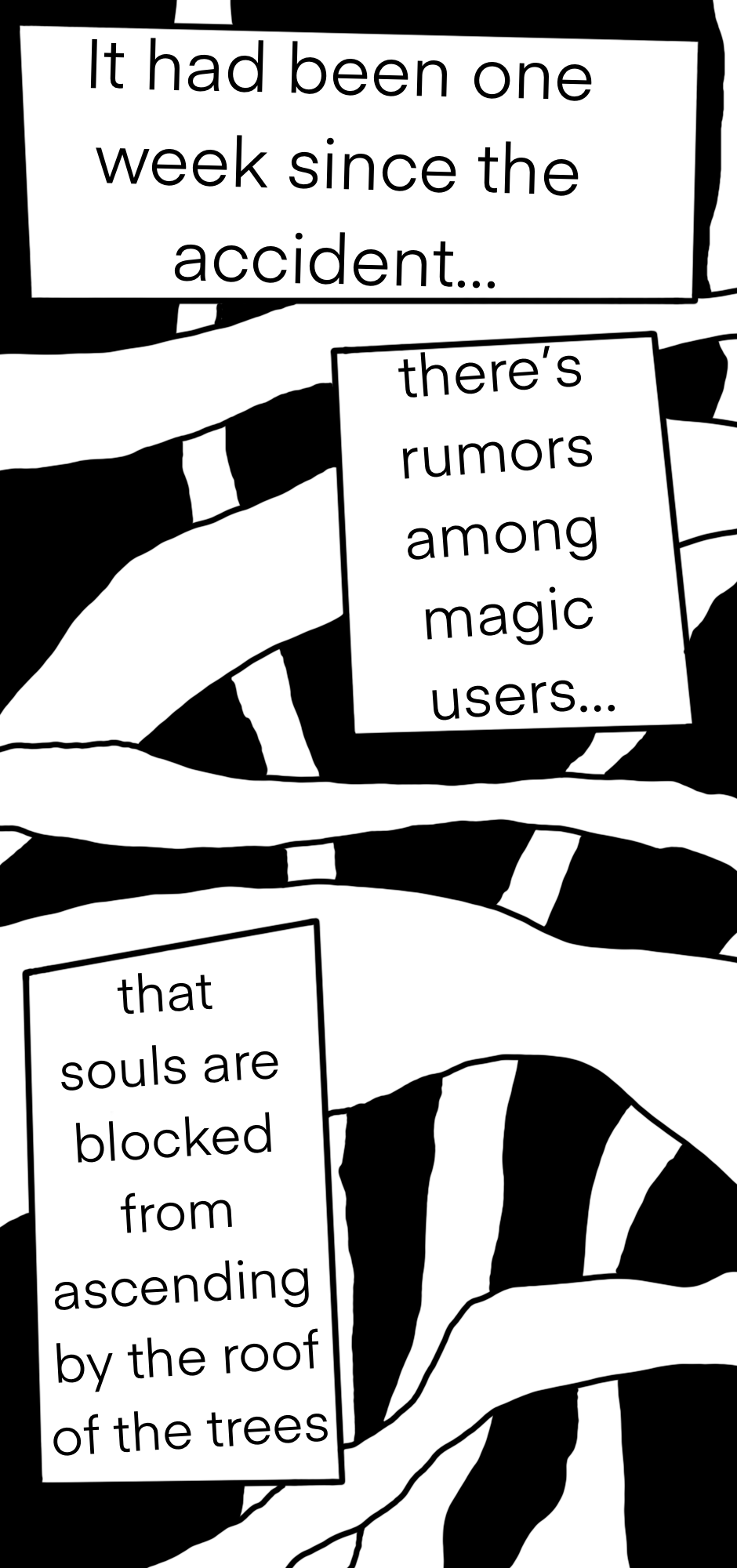 An unusual class of high school students live in a haunted town surrounded by massive trees that block out any natural light from the sky, the trees are worshipped by cults, studied by scientists, and can grant individuals of faith magic powers, but usually they are ignored by the people living under them, as the trees have been there as long as anyone can remember. The reader is guided through this story by an unnamed narrator who seems to exist in a limbo just outside of the one every other character inhabits, and occasionally breaks into fits of hysteria.
