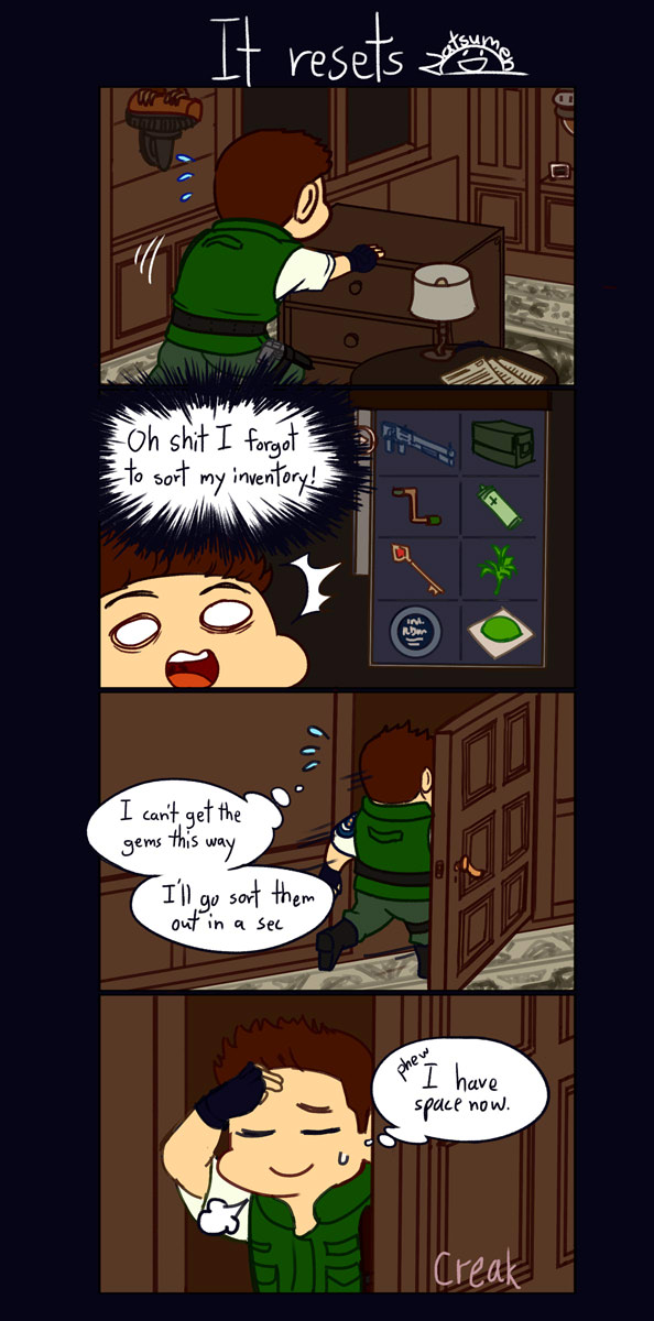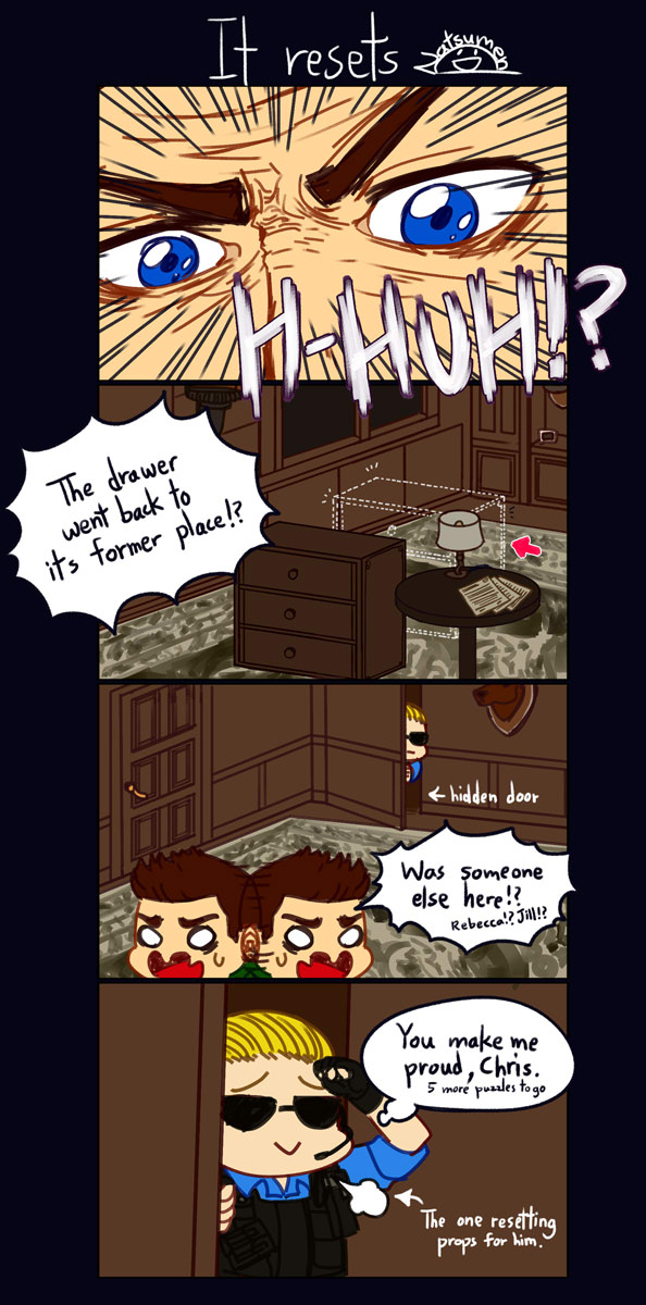 Based on my playthrough on stream where my mod commented when I joked how the props for puzzles always resets the moment you exit the room that there must be hidden doors everywhere (considering the mansion's structure) where Wesker had been the one resetting props' position for Chris, it made me chuckle so I was compelled to draw this. I believe, I want to believe Wesker had been going around resetting props for Chris LOL.