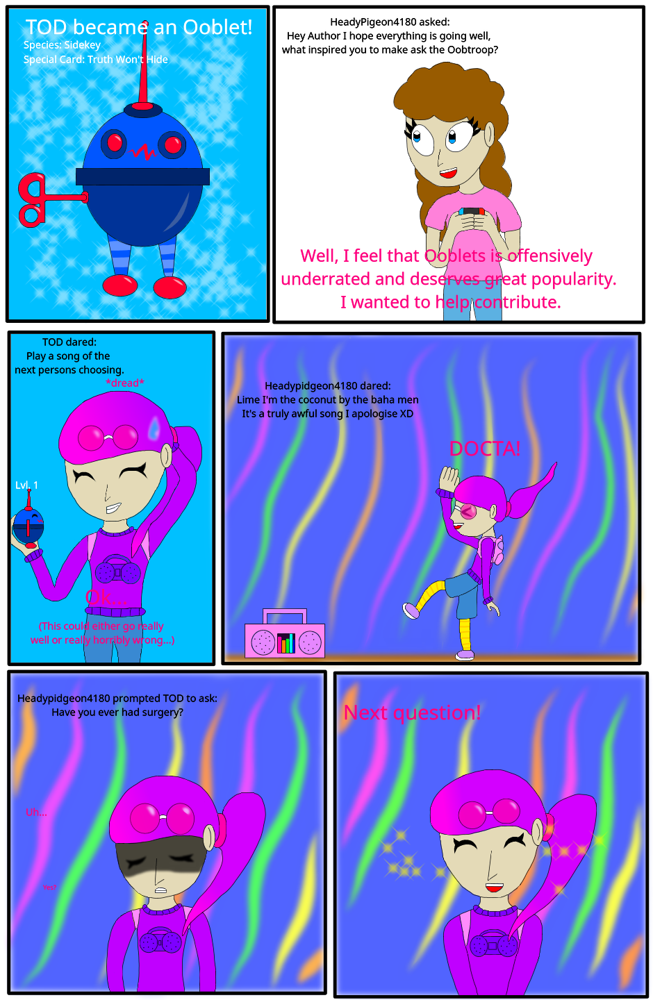 Welcome to the wonderfully colorful world of Oob! Take a load off with many new friends and those cute creatures known as Ooblets! Ask the colorful cast of Ooblet trainers anything you want to know about this world where you can just dance and have fun on the farm, or give silly dares for them to complete! Explore a new region not in the official game known as Bubbloon Island! Be careful though... your actions do have consequences, and the ocean between Badgetown and Bubbloon Island is very deep...