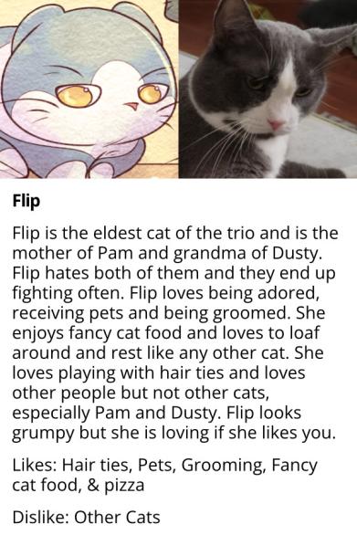 Grandma Flip is the queen of the household. No other cat can throw paws like she can. Speaking of Flip, check out her profile and learn a bit about grandma cat!