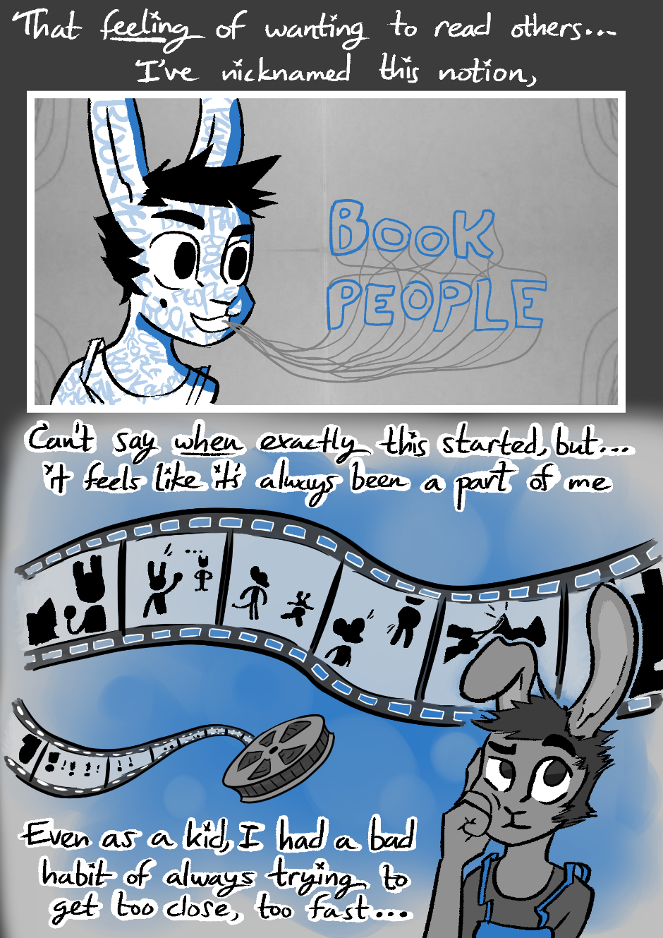 In this world of anthropomorphic characters, we explore tales of people accepting and recounting their life's story. Music is a recurring theme that helps to set the tone. People are more complex than the roles they are pushed into.