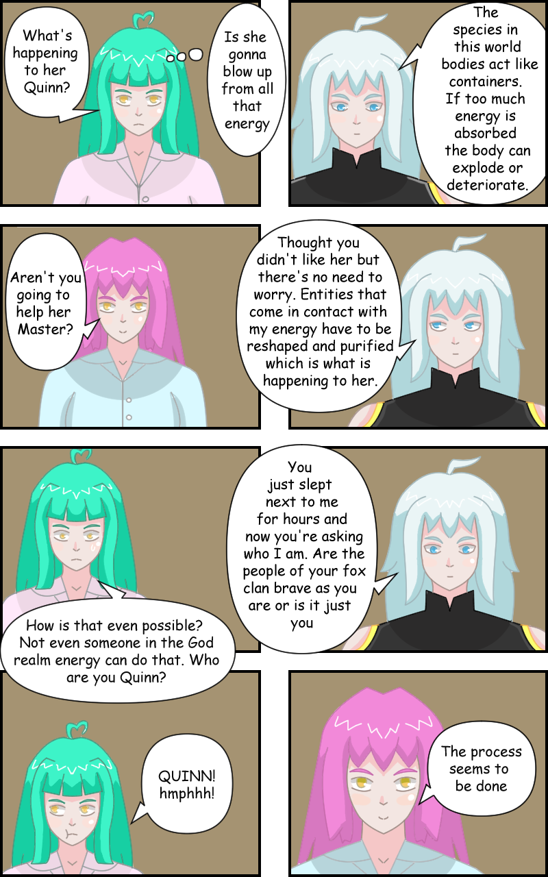 The first singularity in the universe Quinn took a humanoid form millions of years ago. Bored out of his mind , the lonely singularity decides to use some of his energy to jump start an event in the universe which causes the original species of the planet, dinosaurs to be wiped out and a stronger species to come into existence from the combination of his energy with primitive organisms creating beings capable of using magic. On his adventure he falls in love with a native fox lady Evalyn.