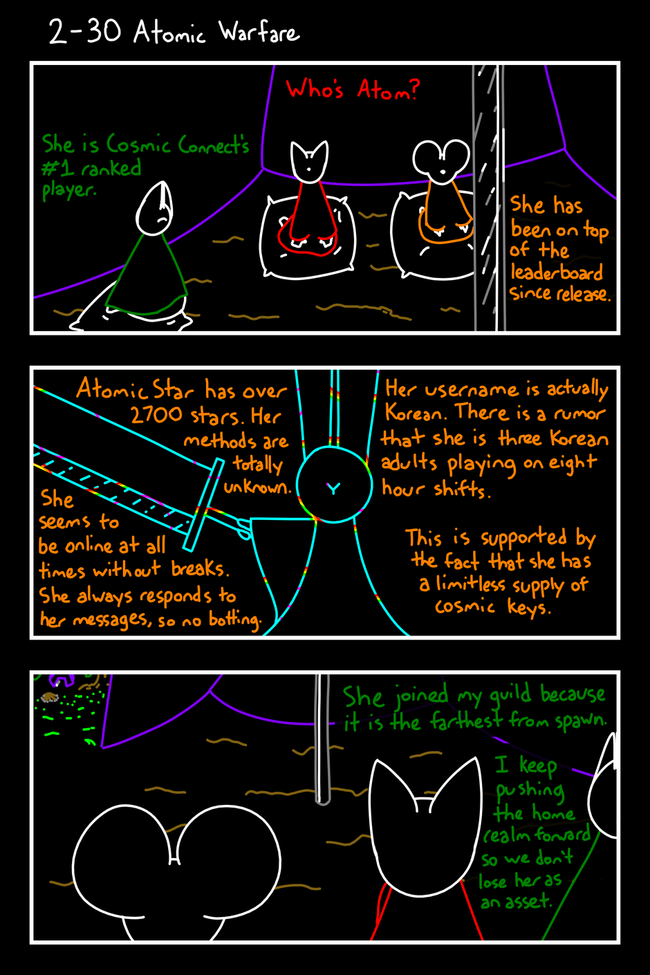 Who's Atom? She is Cosmic Connect's #1 ranked player. She has been on top of the leaderboard since release. Atomic Star has over 2700 stars. Her methods are totally unknown. She seems to be online at all times without breaks. She always responds to her messages, so no botting. Her username is actually Korean. There is a rumor that she is three Korean adults playing on eight hour shifts. This is supported by the fact that she has a limitless supply of cosmic keys. She joined my guild because it is the farthest from spawn. I keep pushing the home realm forward so we don't lose her as an asset.