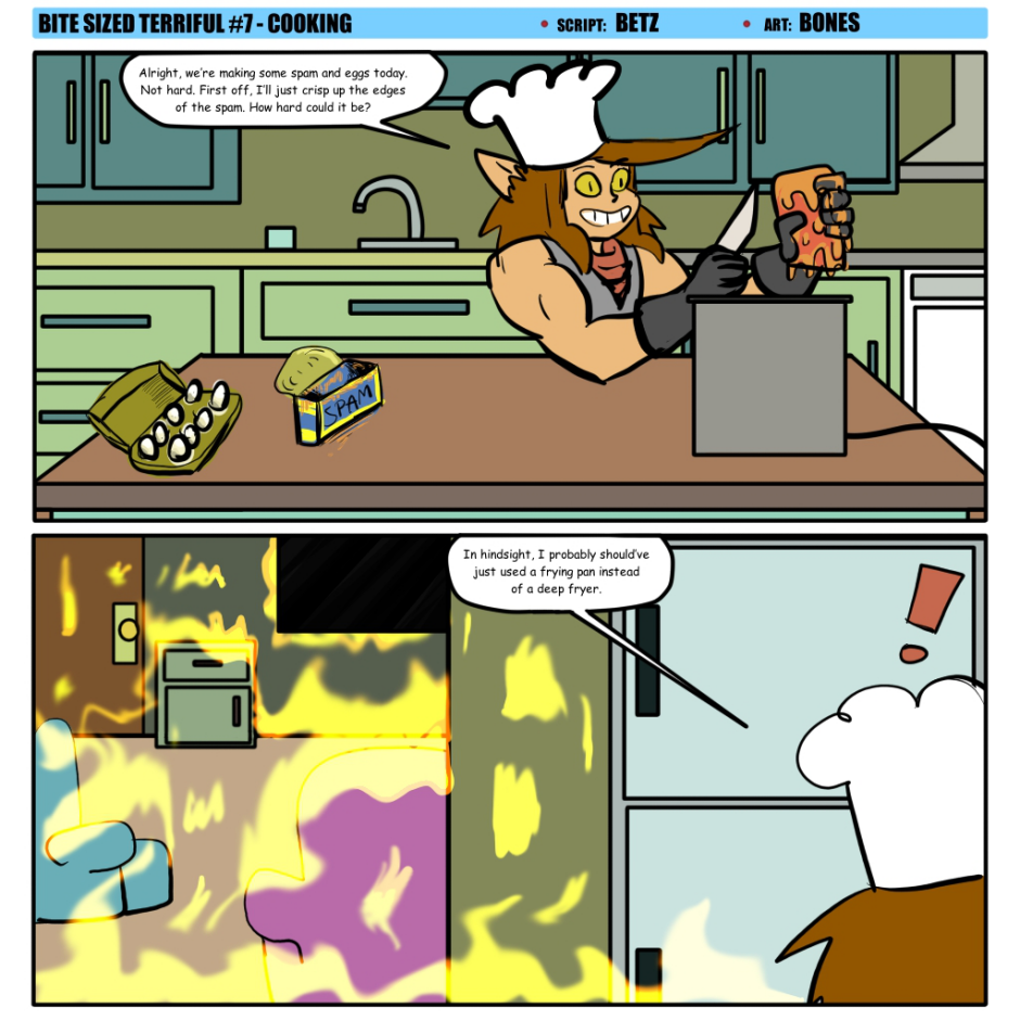 Terriful learns that you use butter to cook spam instead of oil, otherwise you wake up your neighbors at 7am by accident and your apartment has smoke that smells like spam for the next two hours.