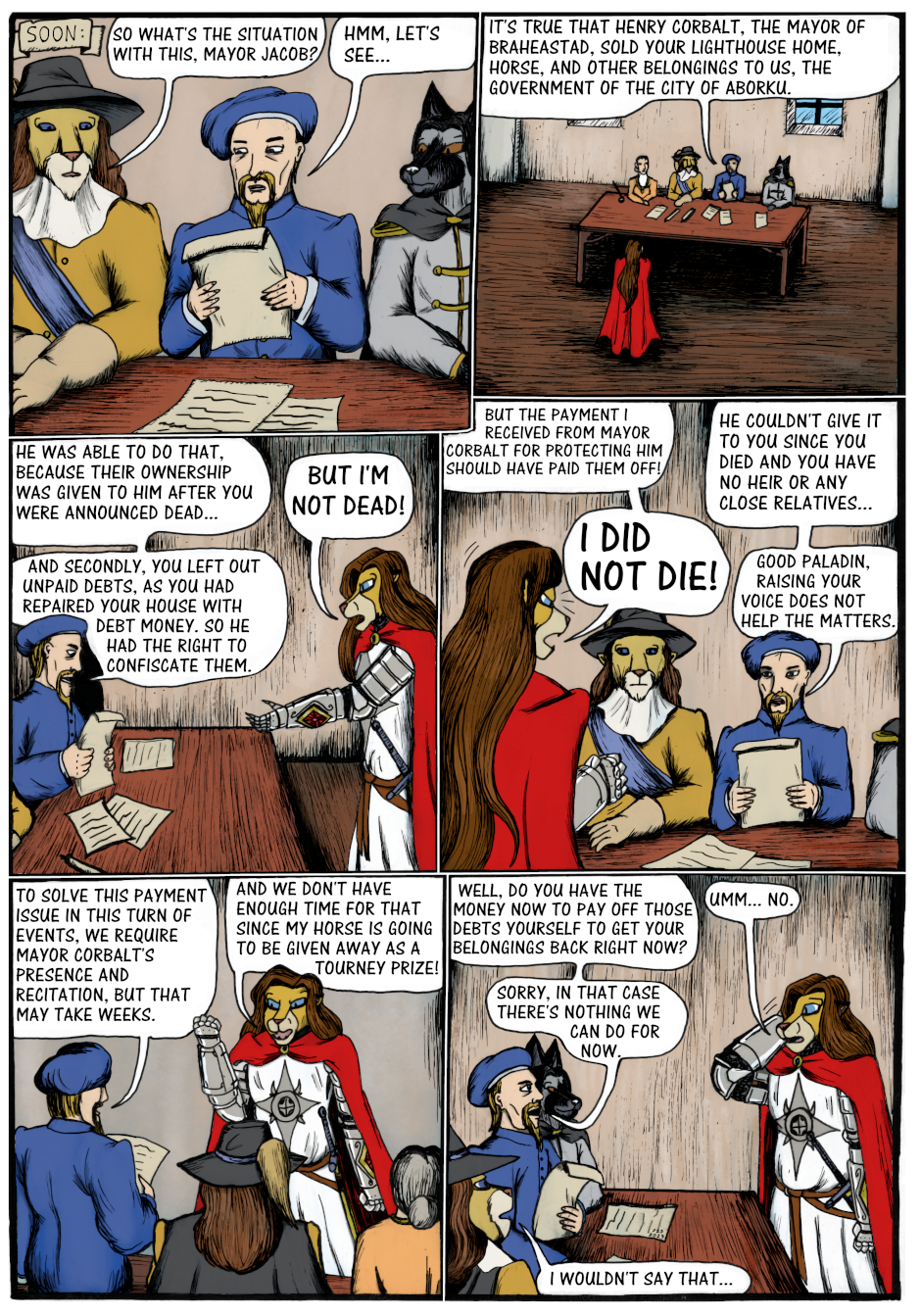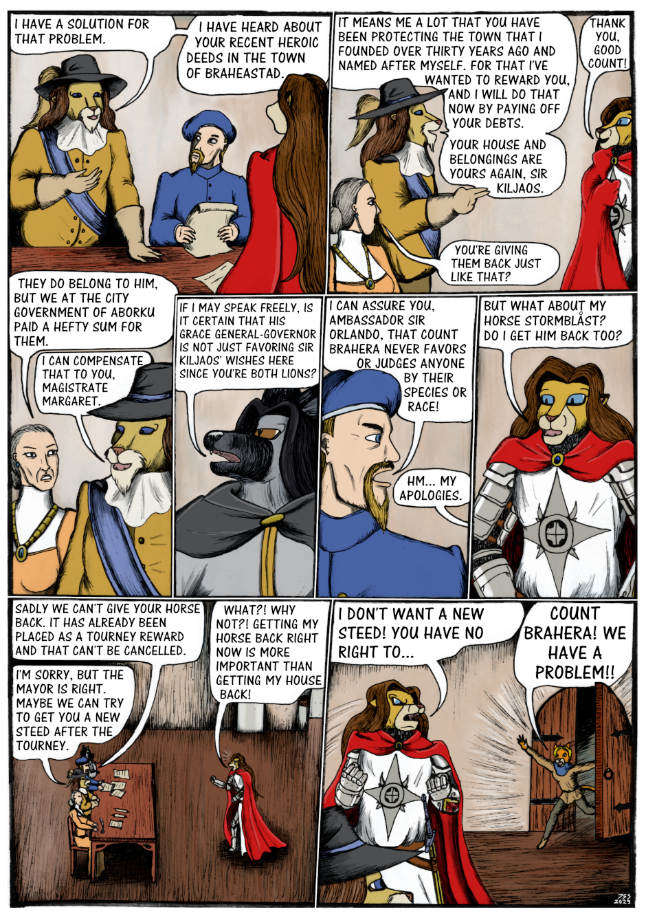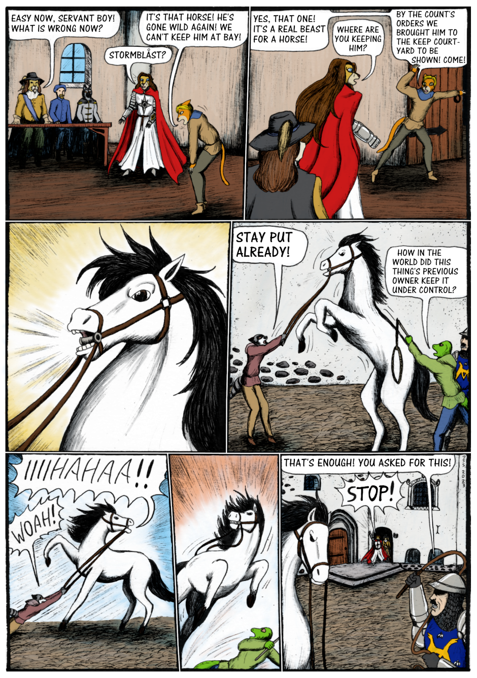Sir Kiljaos has to struggle with bureaucracy as he tries to get his belongings back. Thanks to his past deeds he does get his house and belongings back, but not his horse Stormblåst. As this happens, Stormblåst has been taken to the keep courtyard and he's gone wild. A foolish guard threatens to whip him but thankfully Sir Kiljaos and the others show up right on time.