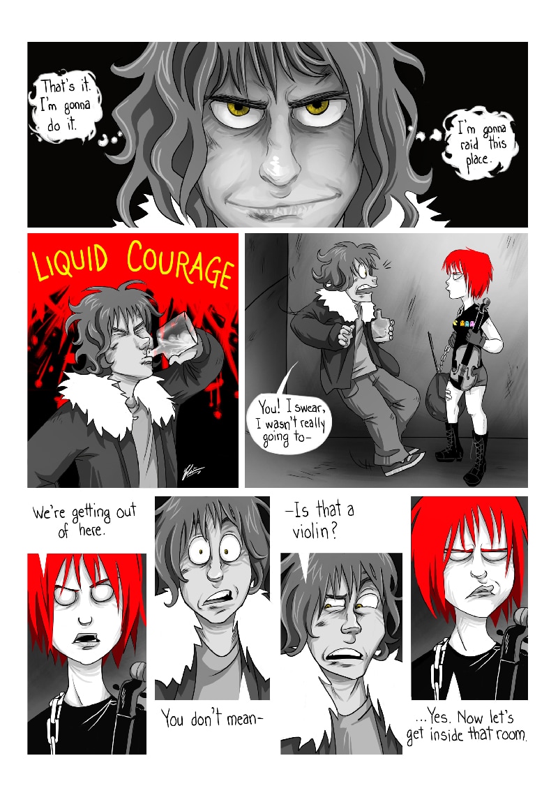 Triple update today! I HATE that top panel! That being said, I still like the rest of the page (the liquid courage shot is one of my top fave comic panels, haha)!