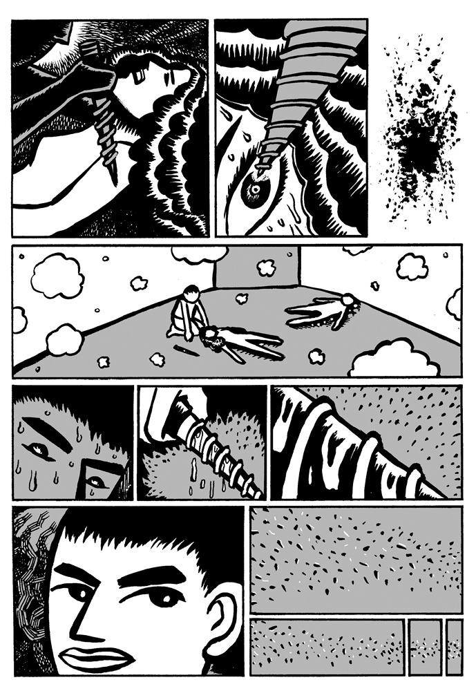 One of the great things about comics is that if the story telling is good, it doesn't matter if the artist and the reader share the same language. The ideas can be conveyed through images. Sometimes this can be a bad thing (as with the recent controversy over the Danish cartoons), but for Malaysian self-publisher Sam Seen's new book China X'perience (2006, Way Publications, Web site) the lack of words doesn't hinder the reading of the stories at all. The book is made up of nineteen short stories (approximately 2-4 pages) that, other than an English title and a short quote, are completely wordless. The lack of words adds to the surreal nature of the stories. In "Bath" a man looks into the drain while taking a shower and gets sucked in. "Fish Man" has a man swimming through the ocean. He eventually grows gills, scales, and a tail before becoming a fish. Other stories are even creepier involving disembodied arms, cockroaches, and murders. It is Seen's art that creates the mood. The protagonist looks to be the same in most of the stories: a bald man with a rarely expressive face. The relatively simple art, but clear story telling, puts the focus on the strange situations the character finds himself encountering. Seen obviously has a creative mind. Each of the stories is unique and has a dreamlike (or nightmare-like) quality. Ignore the title, these stories are universal, and hunt out this book.
