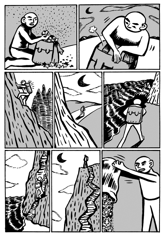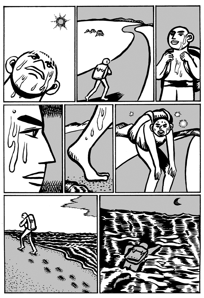 One of the great things about comics is that if the story telling is good, it doesn't matter if the artist and the reader share the same language. The ideas can be conveyed through images. Sometimes this can be a bad thing (as with the recent controversy over the Danish cartoons), but for Malaysian self-publisher Sam Seen's new book China X'perience (2006, Way Publications, Web site) the lack of words doesn't hinder the reading of the stories at all. The book is made up of nineteen short stories (approximately 2-4 pages) that, other than an English title and a short quote, are completely wordless. The lack of words adds to the surreal nature of the stories. In "Bath" a man looks into the drain while taking a shower and gets sucked in. "Fish Man" has a man swimming through the ocean. He eventually grows gills, scales, and a tail before becoming a fish. Other stories are even creepier involving disembodied arms, cockroaches, and murders. It is Seen's art that creates the mood. The protagonist looks to be the same in most of the stories: a bald man with a rarely expressive face. The relatively simple art, but clear story telling, puts the focus on the strange situations the character finds himself encountering. Seen obviously has a creative mind. Each of the stories is unique and has a dreamlike (or nightmare-like) quality. Ignore the title, these stories are universal, and hunt out this book.