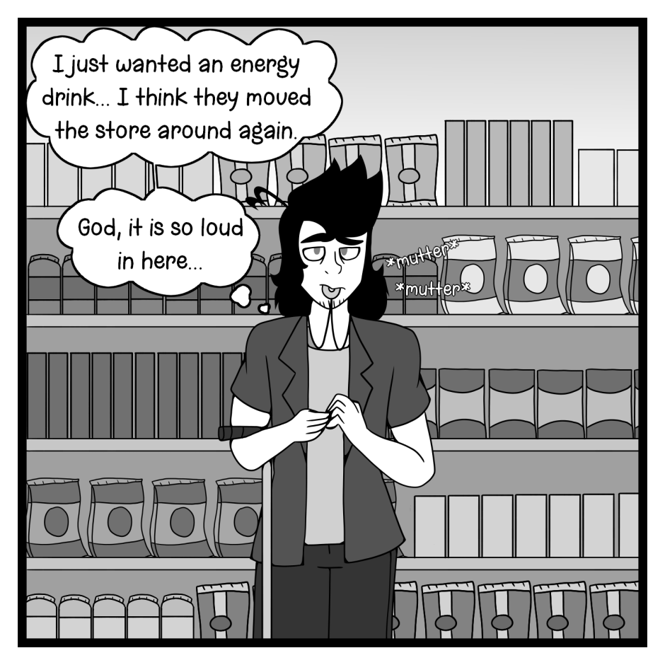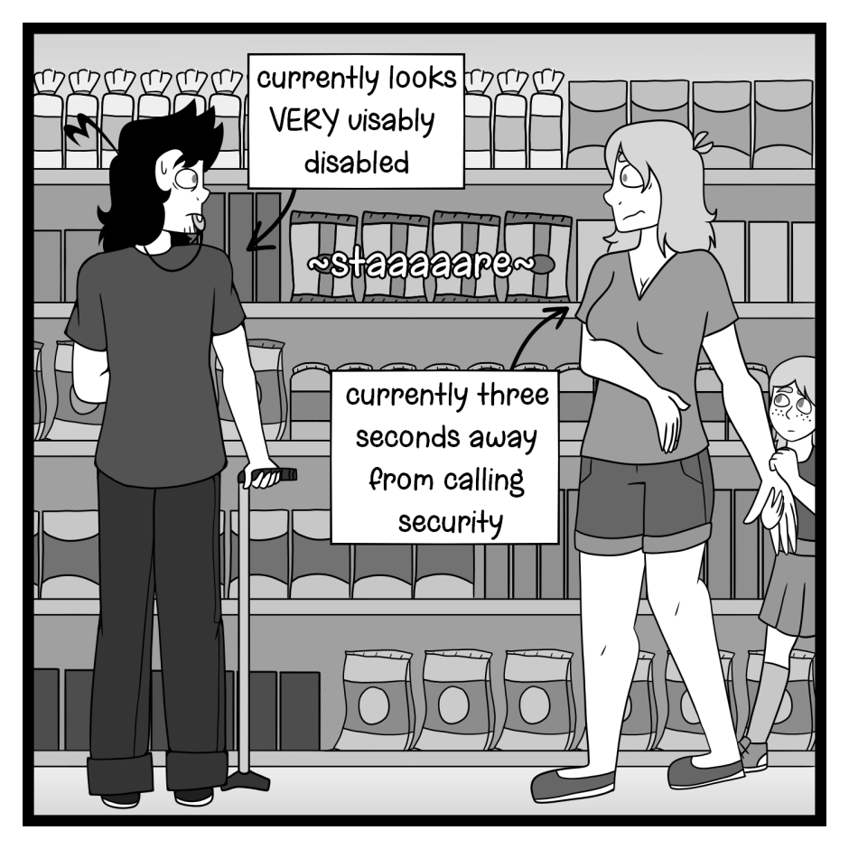 Ableism at it's finest folks! There's a reason I haven't gone to a grocery store in literal months. I just get my groceries delivered now. Grocery stores are way too overstimulating and if I try to mask my symptoms while I'm grocery shopping I just end up going into a shutdown for the rest of the day. However, if I don't mask my symptoms I risk some random lady calling security on me.