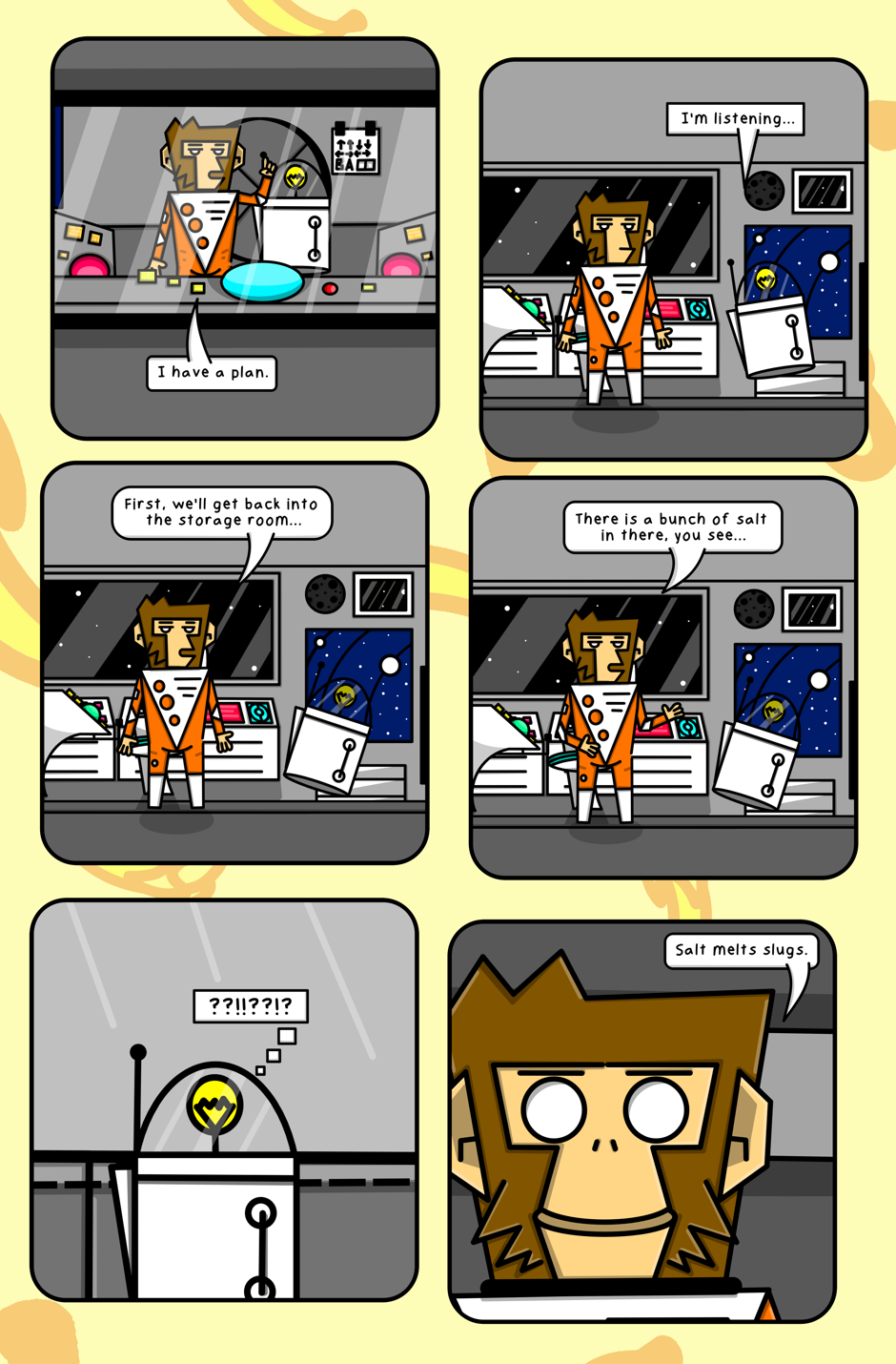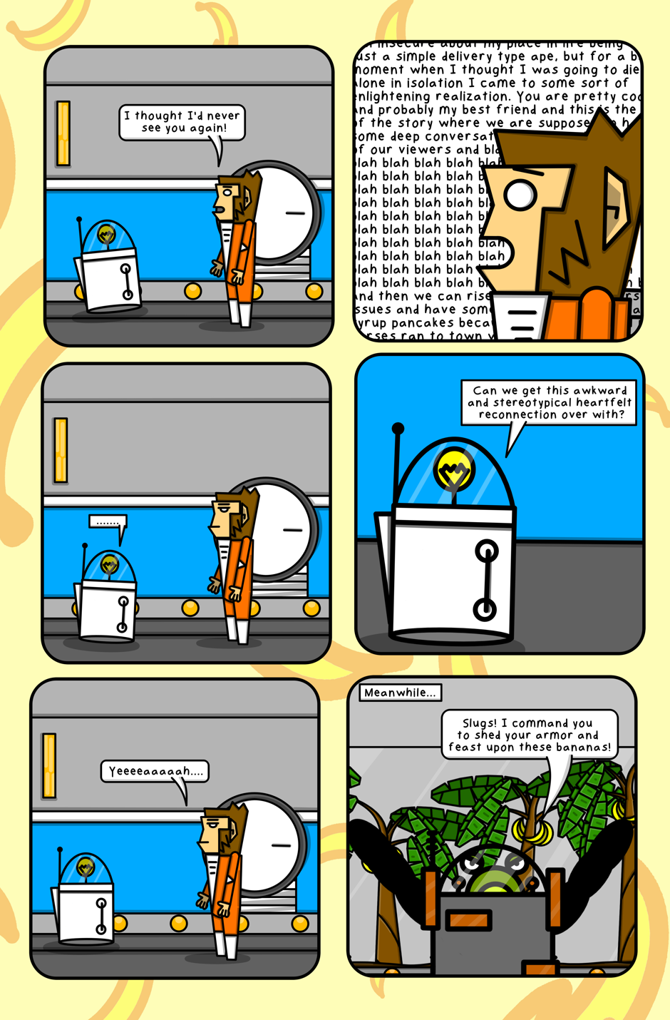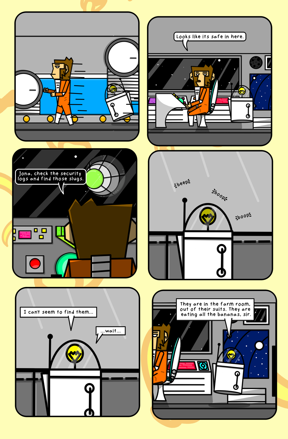 In 'Slugoids from Planet Slimulous 3' you'll get to meet our esteemed astrochimp, Captain Donut, as he treks through space with his trusty sidekick JONA. Throughout their story they thwart the evil sapce slugs in an effort to save bananas for all of Apekind.