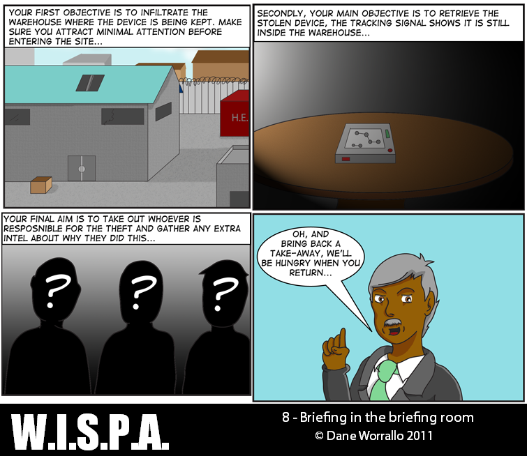 W.I.S.P.A. (Worldwide Independent Spies and Professional Agents) is an agency that undertakes the jobs that others won't do. Focusing on a team of seven agents, they take on rogues, mercenaries, shadowy organisations and large corporations to keep the peace and deal out justice in a mixture of action, comedy and drama.