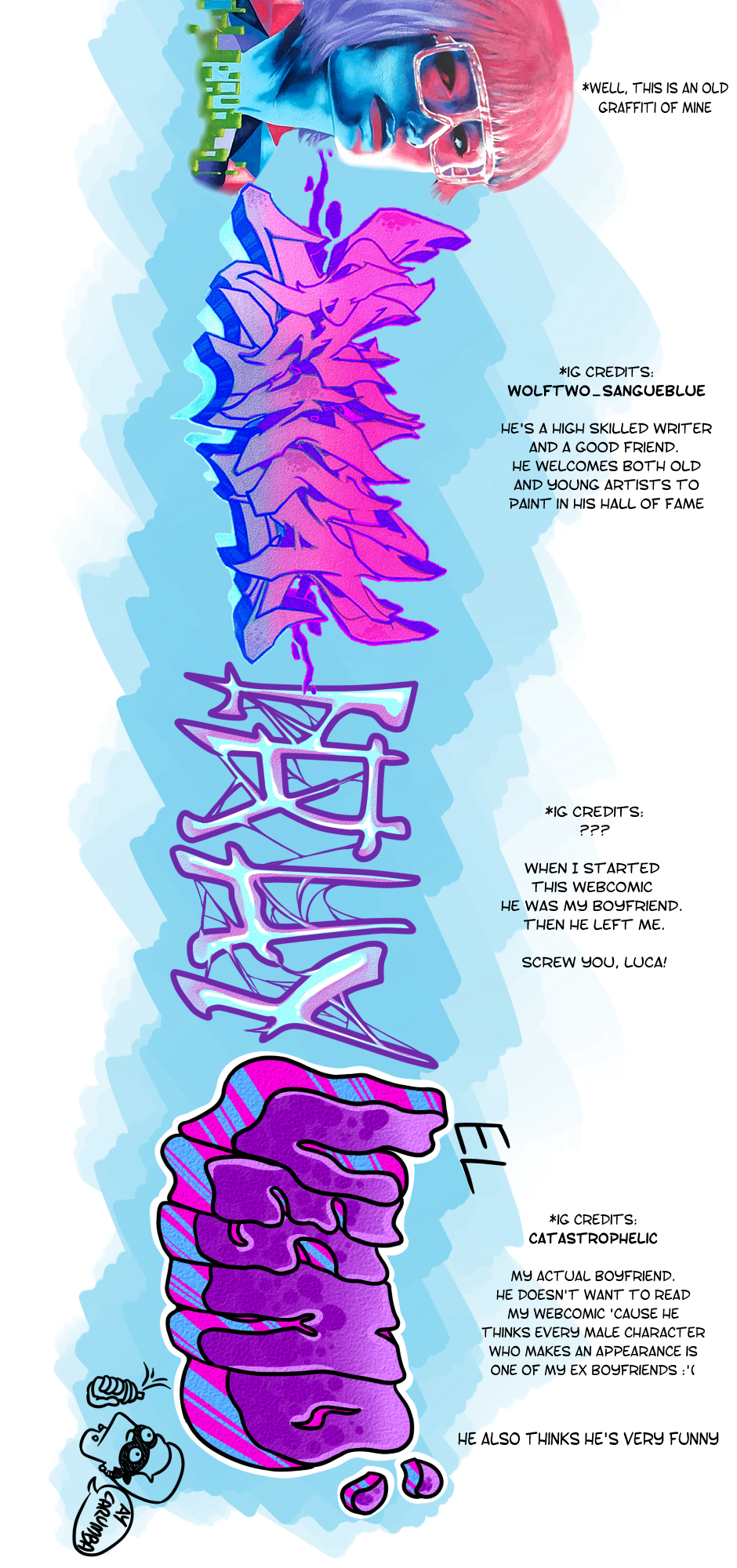 A couple years ago I asked some friends to sketch a graffiti for a tag of choice between XOXO, Penta, Iruy and Vesm and everyone did their part the way they preferred. Some sketches were very bare and I heavily edited them. I suck at letters but it's easier to work with a pre-made structure.