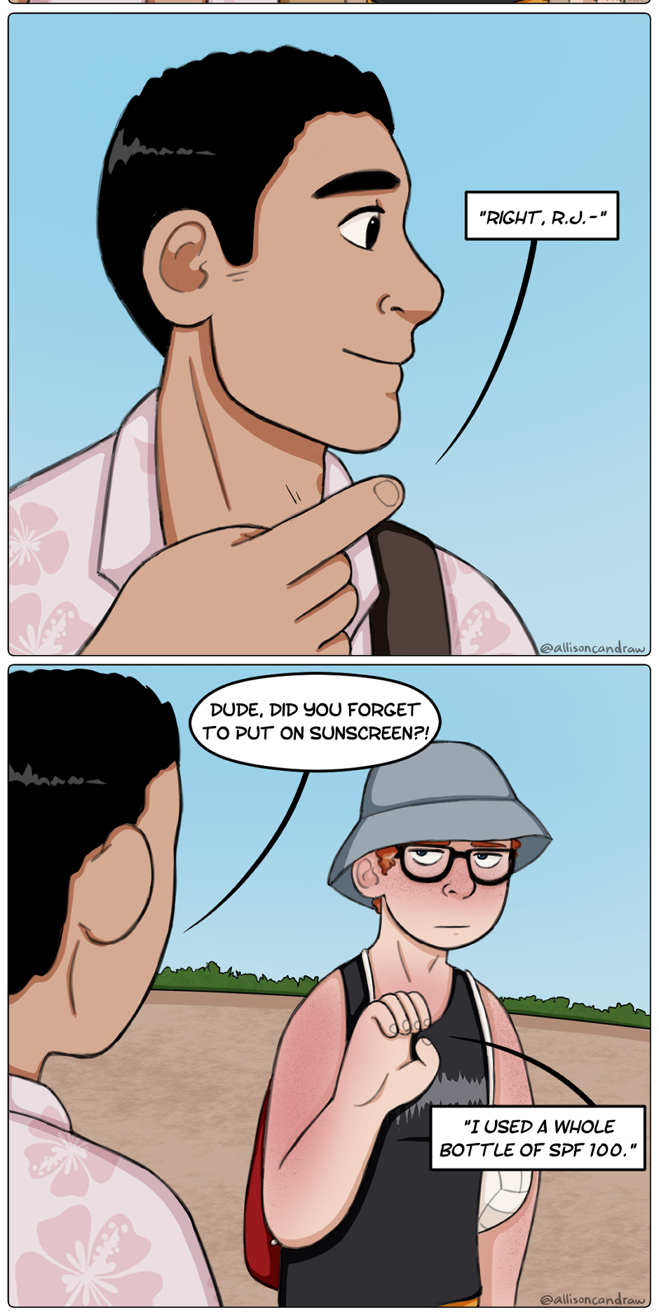 There's two types of people at the beach; you either tan easily like Bobbie or burn to a crisp like R.J.. Which one are you? Check out my Patreon for early access to comics, WIPs, and more! https://www.patreon.com/allisoncandraw My links/socials: https://linktr.ee/allisoncandraw