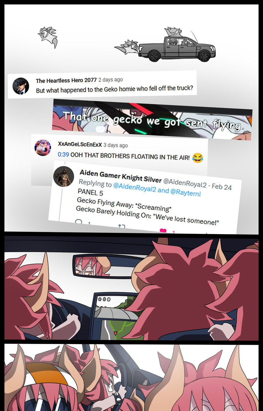 A fan-made little comic with the cyberpunk vtuber Zentreya and her community of geckos.