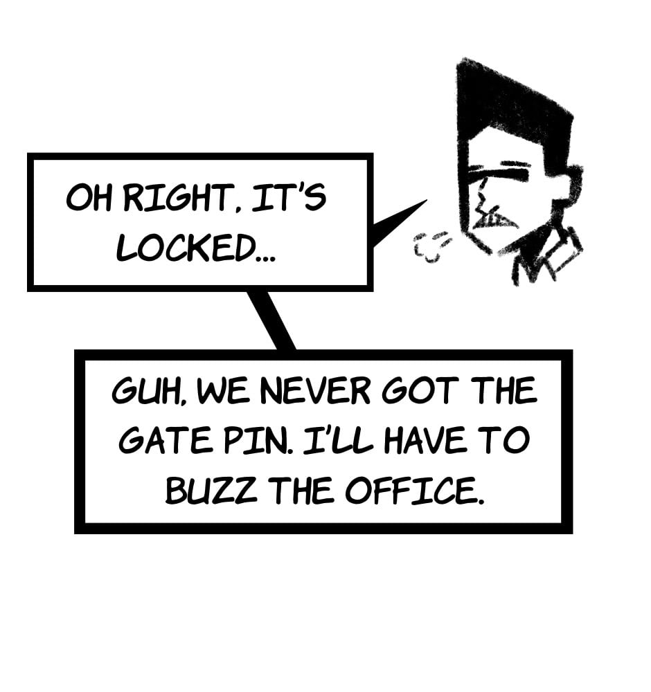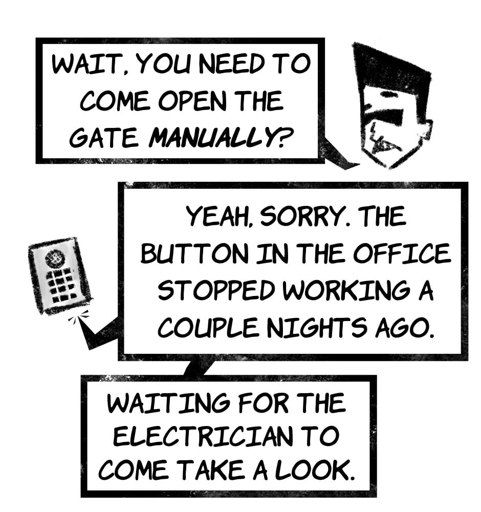 I don't think that the gate not working is a coincidence timing wise. I'll want to see where the line is that connects the box here to the office. I wonder if-- wait. Is that... Jenn?