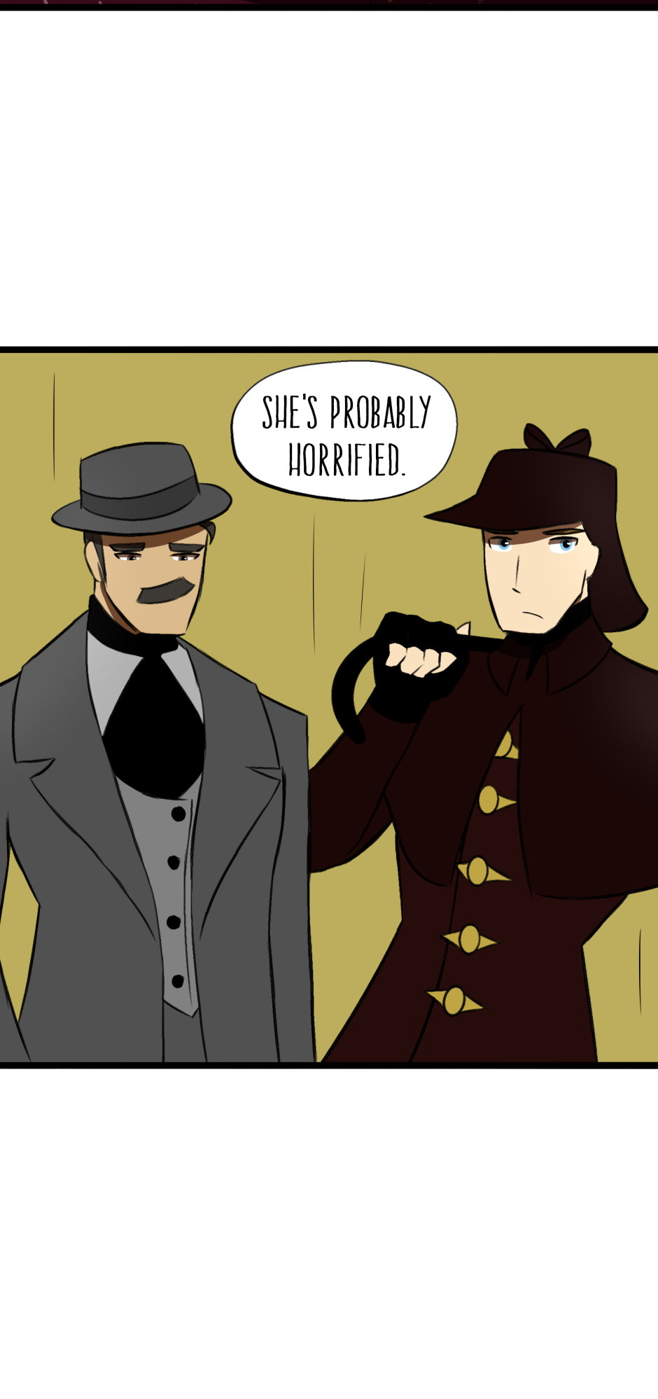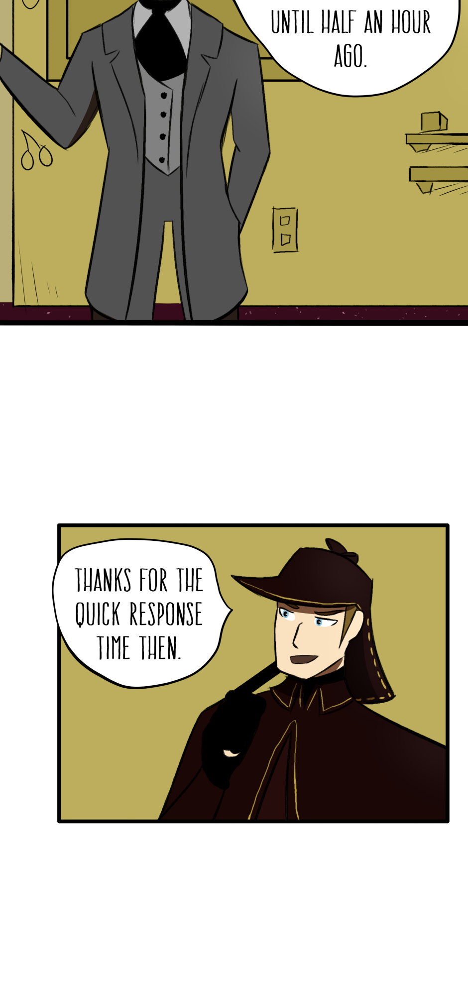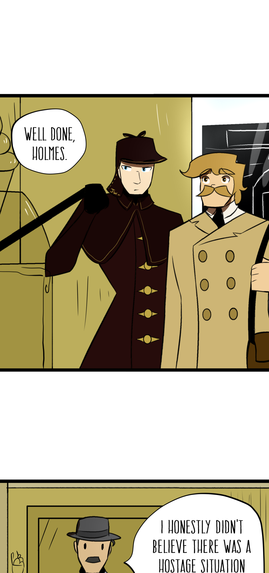 I LOVE this comics, although I do have one small note, wich may be just my opinion. And The note is, Sherlock is a more quiet person, and more calm, he wouldn't het mad at the machine like that, he would more likely look around more, but maybe that's just what I feel like, I like this comic anyway