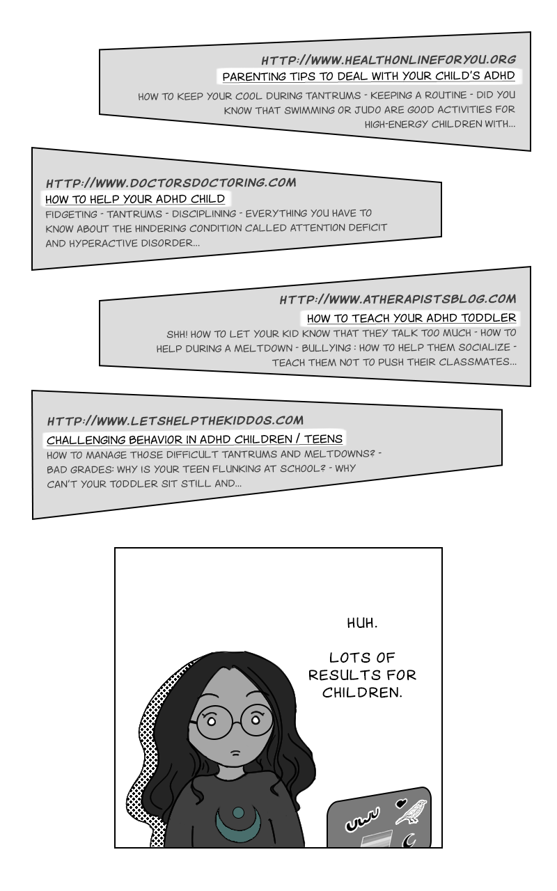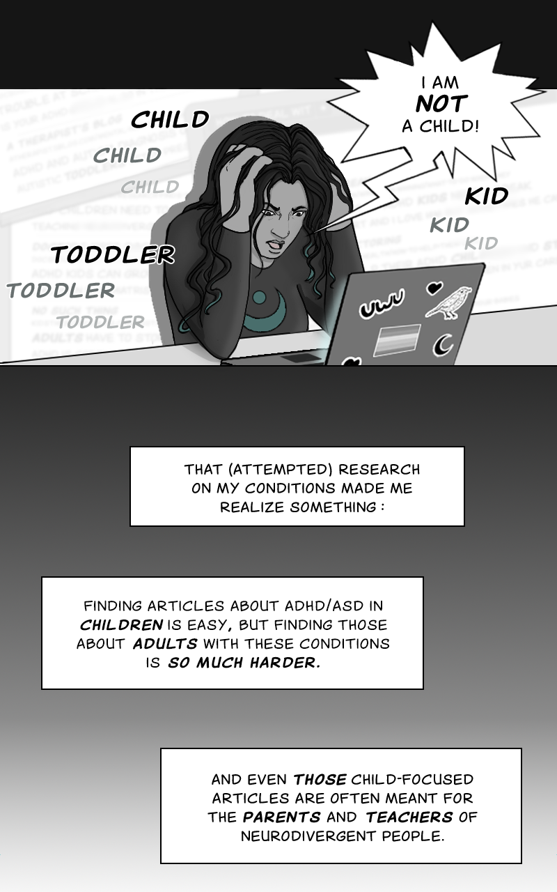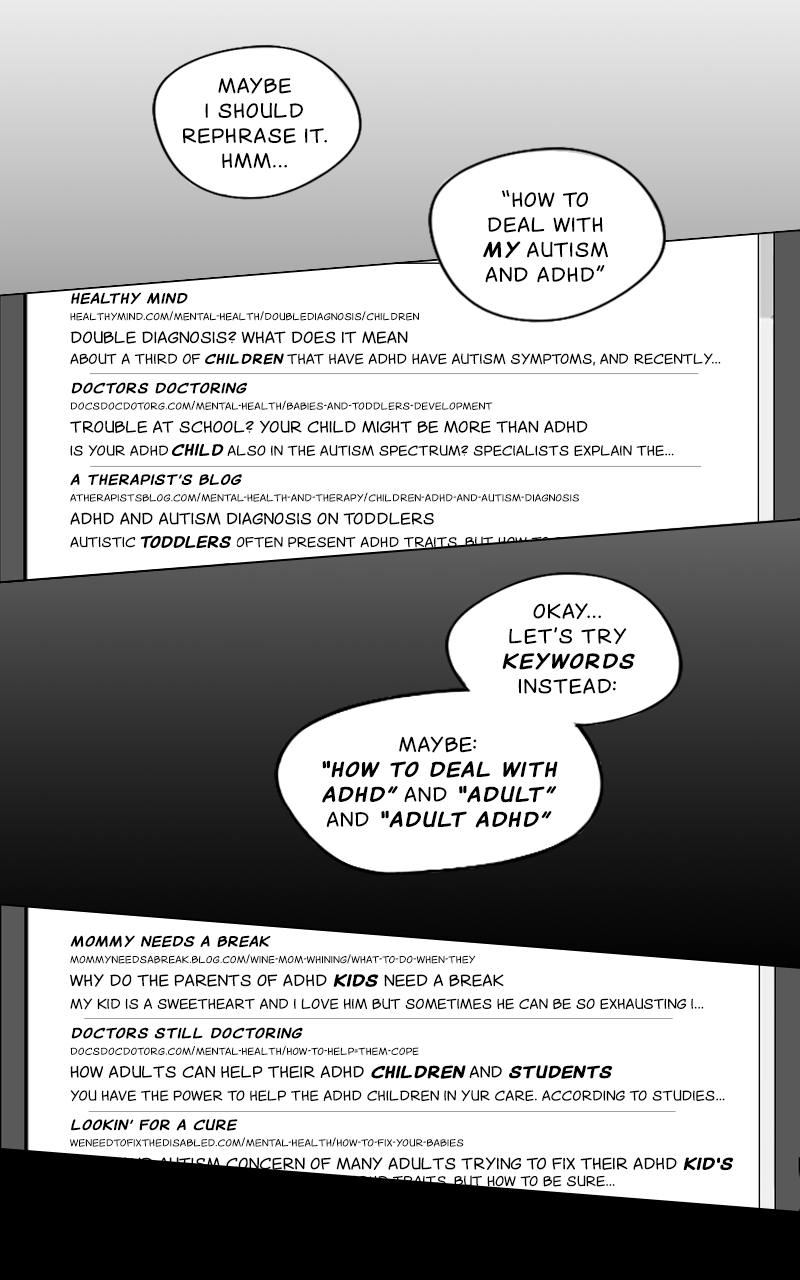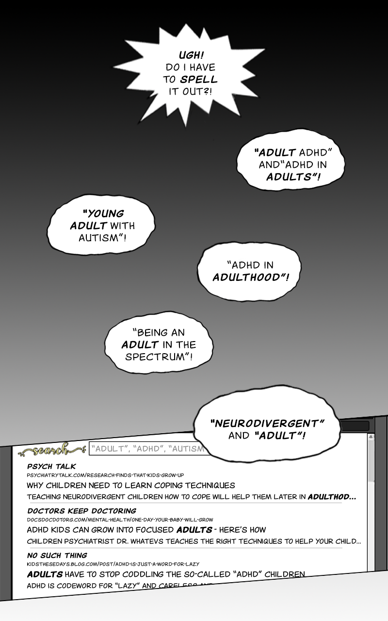 It's time to talk about the universal experience of being an ADHD and/or Autistic adult trying to find more on your condition... and having to wade through a flood of results targeted at neurodivergent children and their parents!