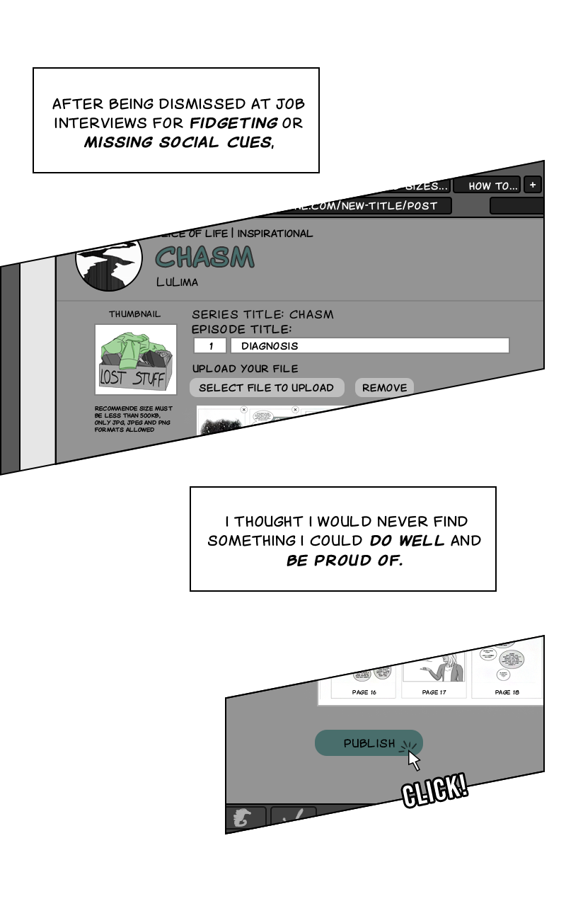 Chasm is a series about living with ADHD and Autism. Narrated in mostly biographical short stories, it explains the highs and lows of living with these conditions.