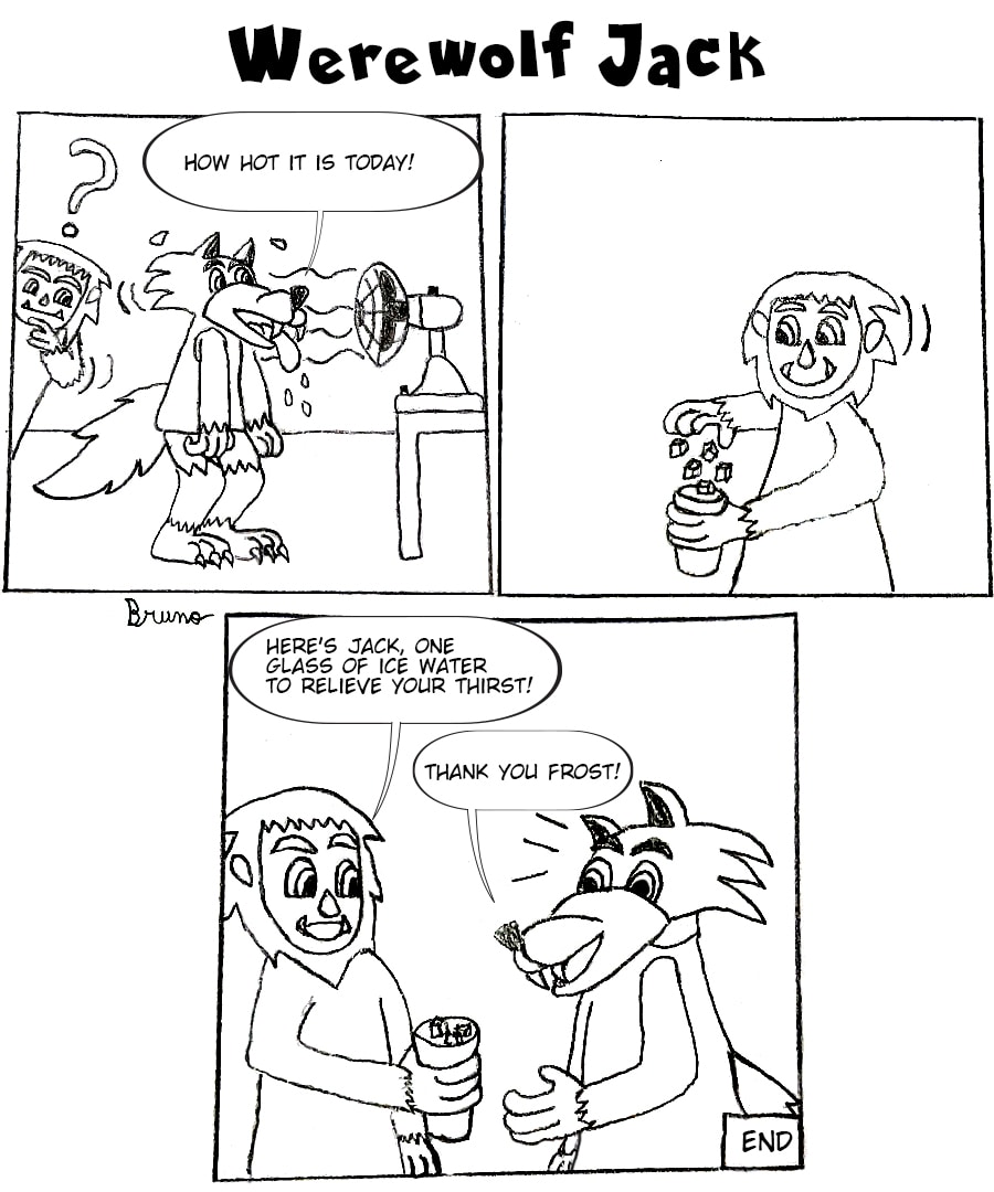 The Yeti Frost, seeing that the werewolf Jack was hot, used his power and put ice in a glass of water to relieve his friend's thirst!