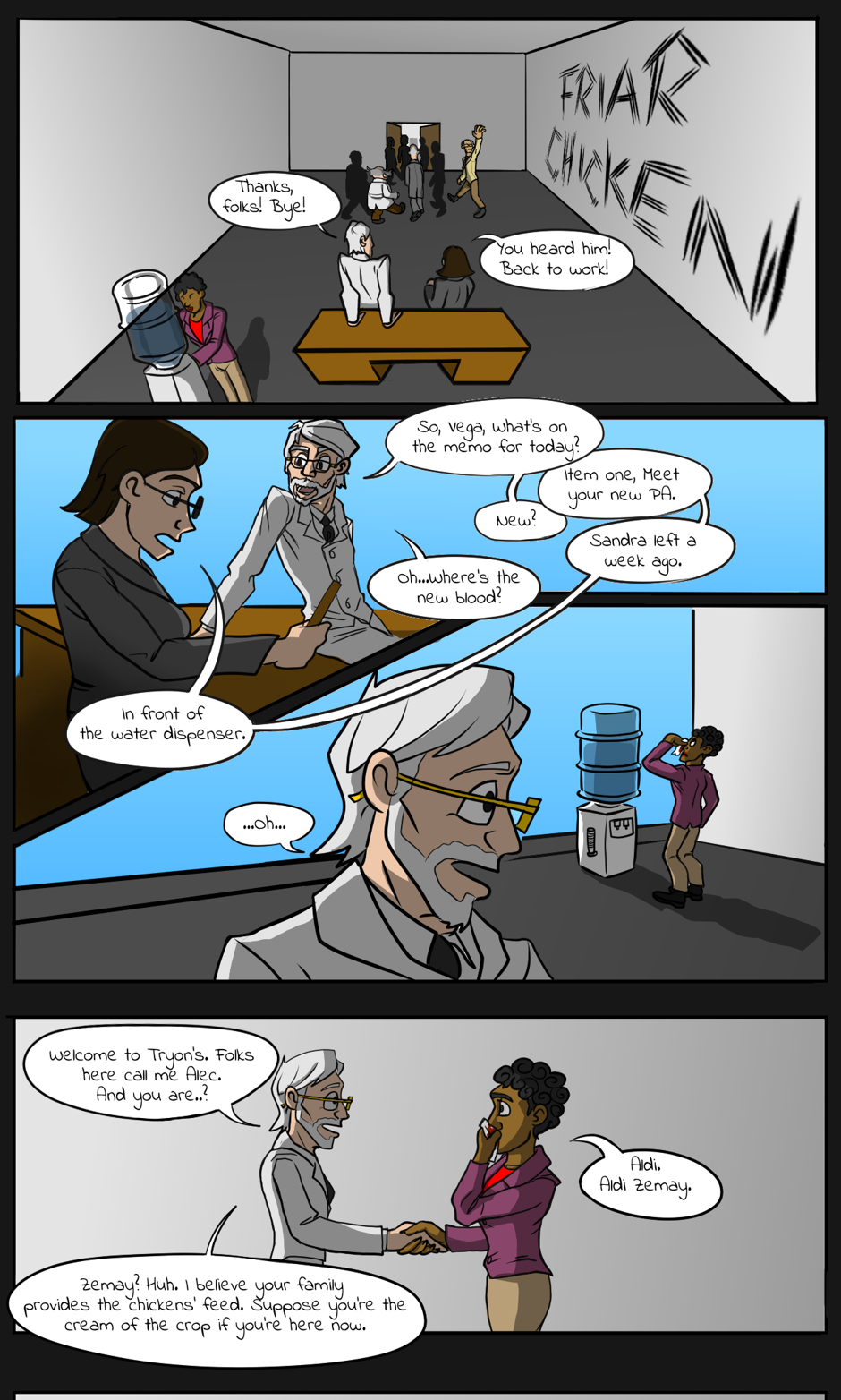An awkward first convo between Mr Tryon and his newest PA, Aldi Zemay.