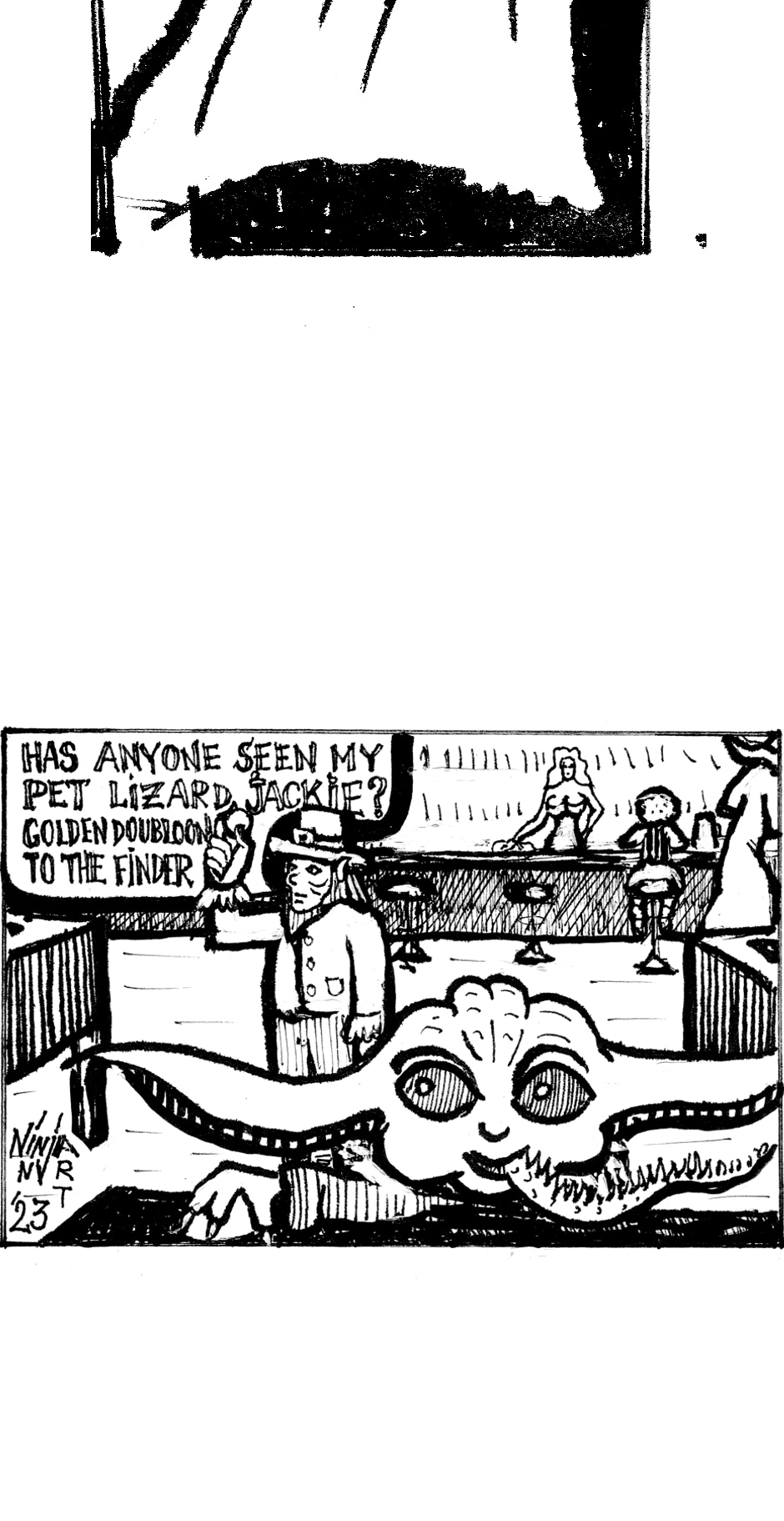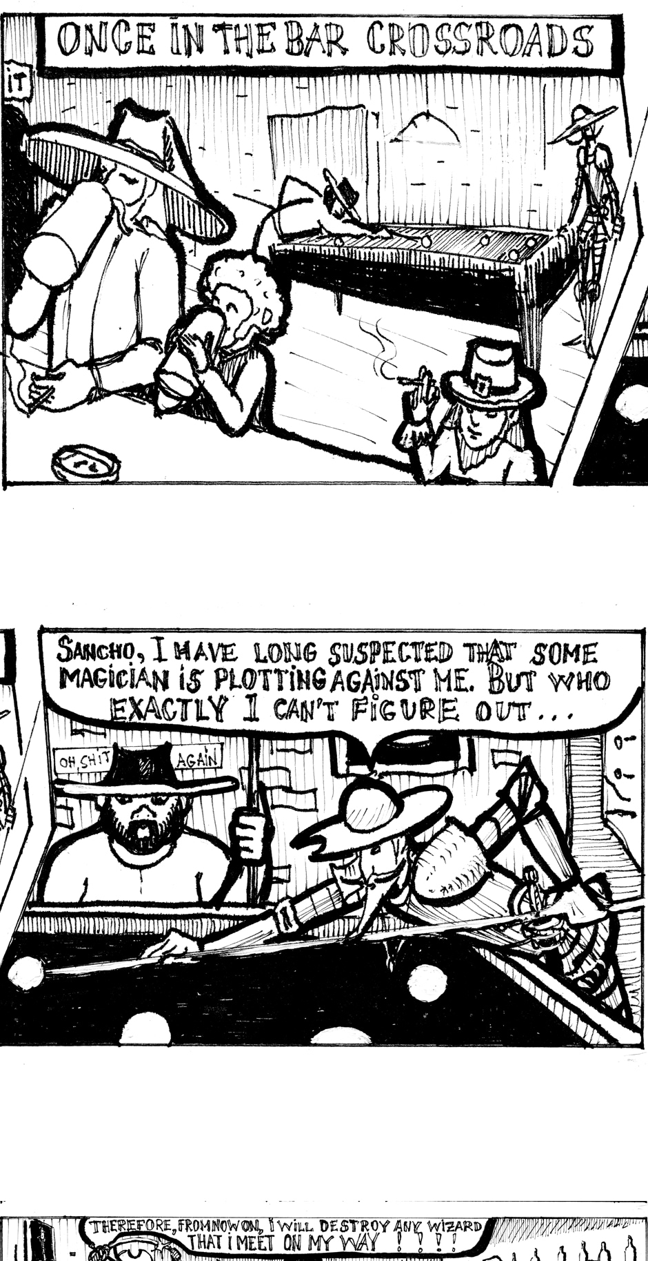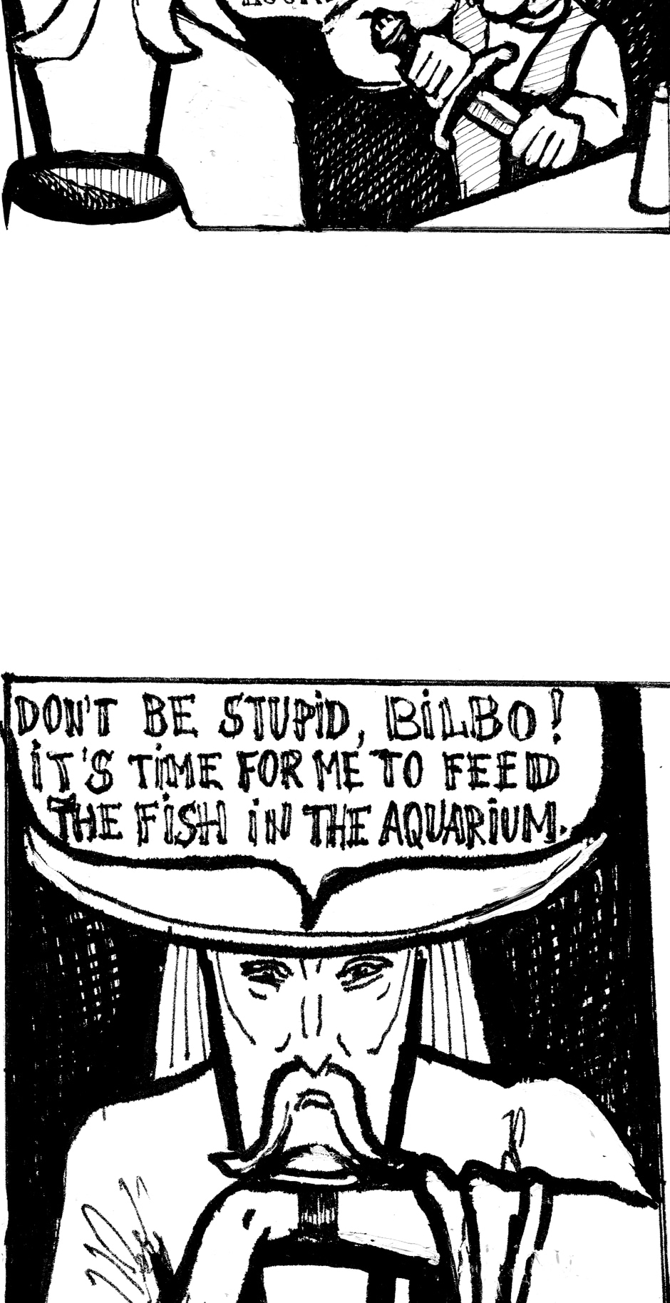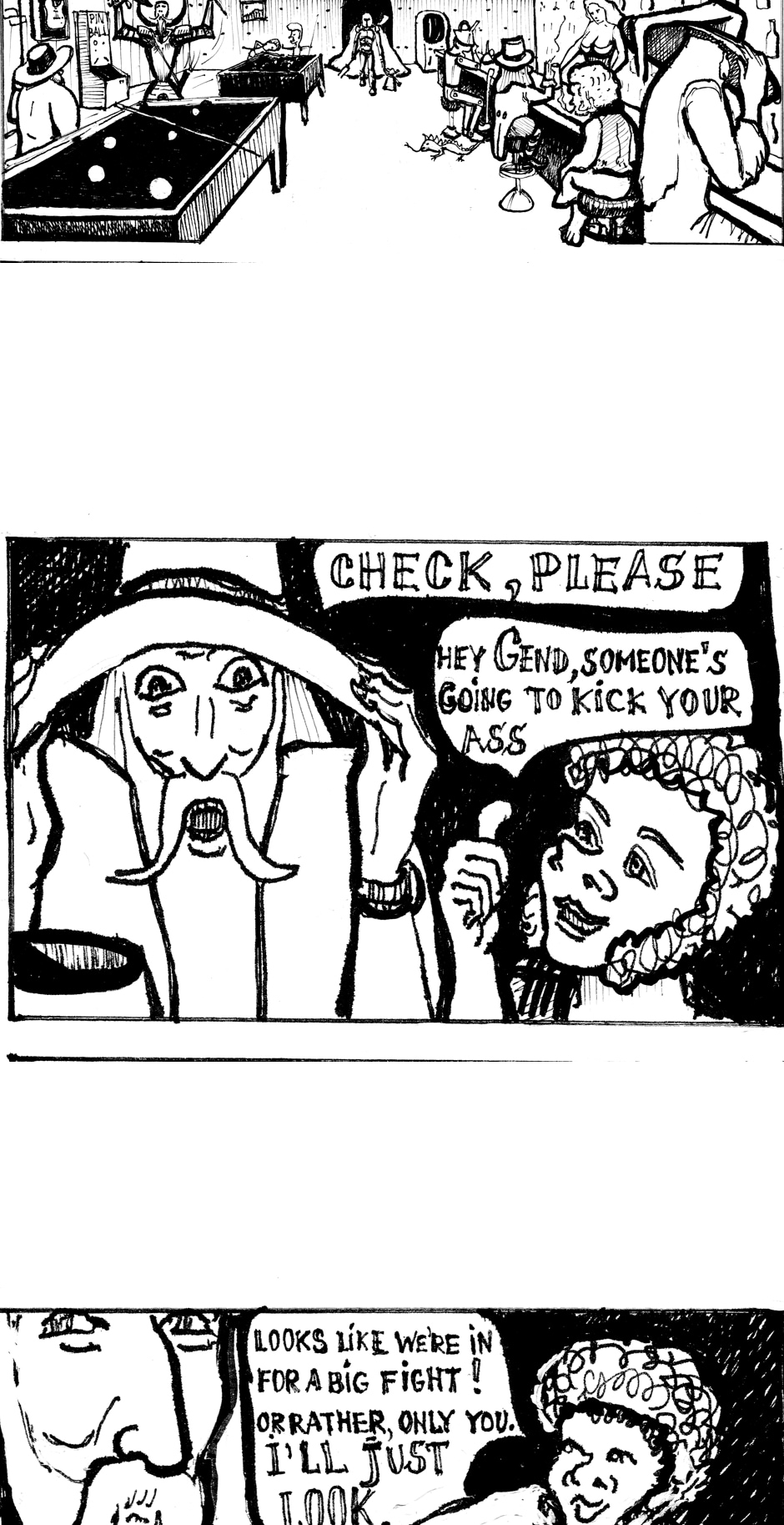 This part of the comic tells how the wizard Gandalf meets the knight Don Quixote in the Crossroads bar. And the little Jedi Grogu meets a Leprechaun's pet lizard.