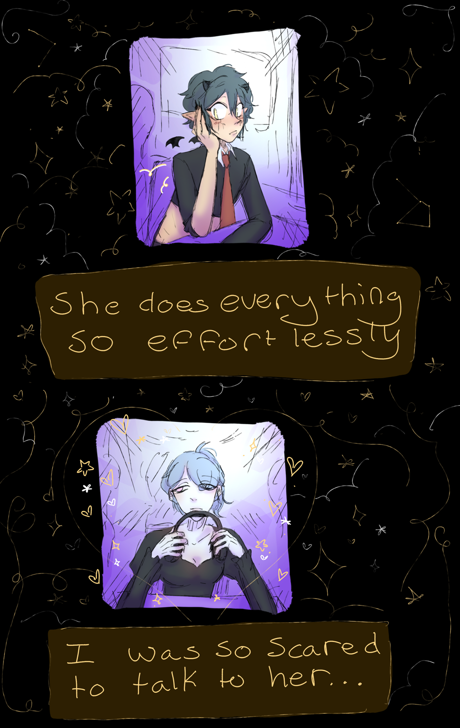 A human, Veronica, meets a demon named Damien disguised as a bat and lets him into her house. When Veronica realizes his true form, she discovers he’s in need of a home. She chooses to let Damien stay but will only be met with chaotic events. Follow these two and their friends as they learn more about each other.