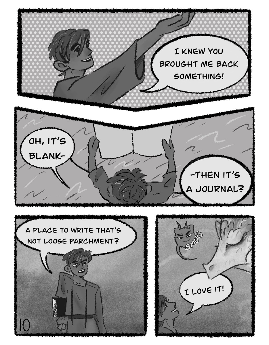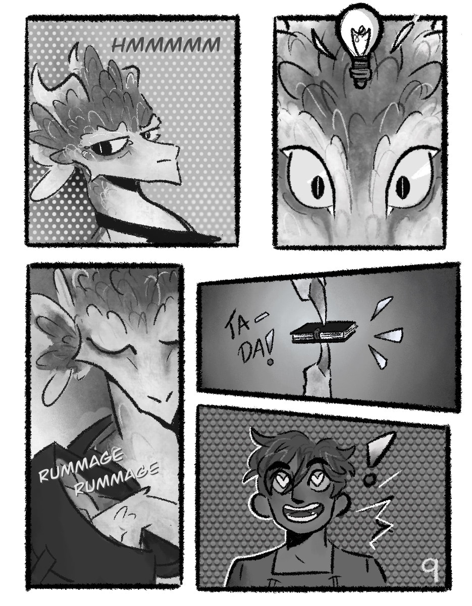 A black-and-grey comic about Em! They live with their Dad who happens to be a dragon, and spend their days collecting and sorting items for their hoard. Together they find a lot of really cool stuff, but find it easy to compare their self-worth with the numerous valuable artifacts in the family vaults. After all, how can one run-of-the-mill human child compare to the weapons of mass destruction, piles upon piles of gold, and stacks of ancient knowledge that sit in their own pantry?