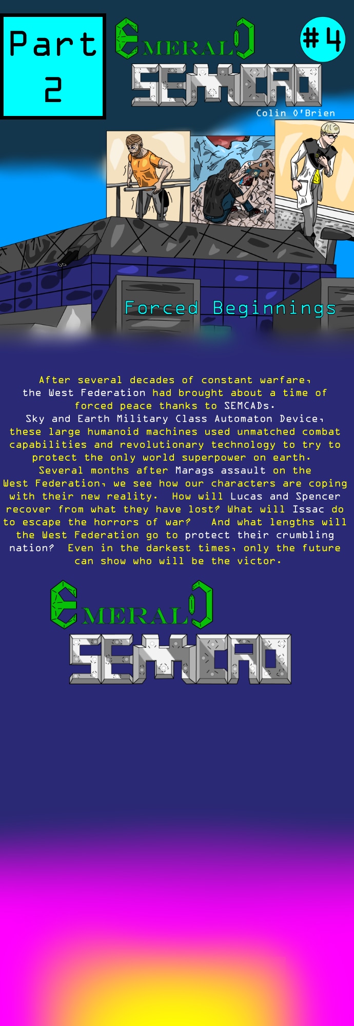 After several decades of constant warfare, the West Federation has brought about a time of forced peace thanks to SEMCADs. Sky and Earth Military Class Automaton Device, these large humanoid machines use unmatched combat capabilities and revolutionary technology to protect the only world superpower on earth. We follow Spencer Parid, a pilot for the West Federations Semcad unit working with his friends, Lucas and Issac. while Semcad technology has been kept secret from the rest of the world, with only five Semcad inventors knowing how to make parts of a Semcad, how long will this last? Even a secret as well kept as the inner workings of Semcads has to be discovered by the rest of the world eventually. when this happens, only the future can show who will end as the victor.