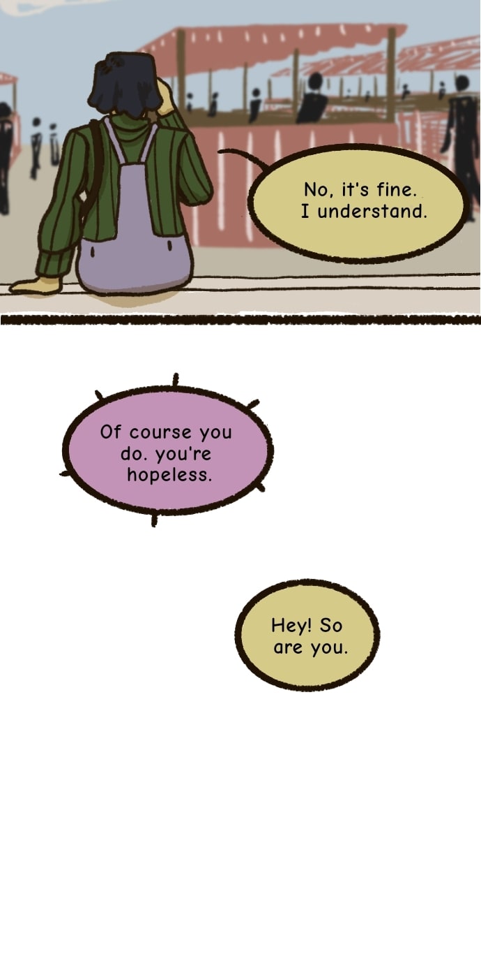 Jackie Patel screwed up. Even so, she's surprised to find herself giving up everything she's currently doing and moving to the small town of Paxton. Here, she meets Marcie Smith, who might just be the nicest (and most forgetful) person she's ever made aquaintance with. Jackie's determined to leave her past self behind - even if that means throwing all of her principles out of the window and opening herself up to friendship. And, possibly, something more than that... (GL/slowburn)