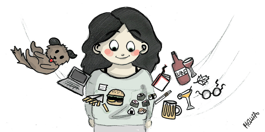 Just a drawing that you are going to see everywhere as it's now my cover banner ! As you can see, there is almost everything I like : food, my dog, alcohol. My friends are missing but, I always draw them ugly so they don't like it. But I can't draw them pretty because I draw little characters with round faces so, I don't really have a choice. Anyway... that's it.