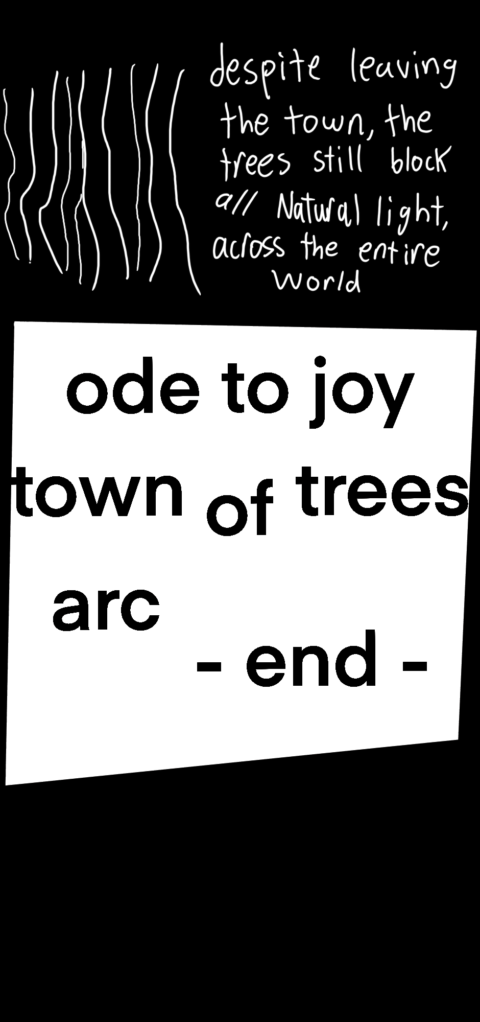 An unusual class of high school students live in a haunted town surrounded by massive trees that block out any natural light from the sky, the trees are worshipped by cults, studied by scientists, and can grant individuals of faith magic powers, but usually they are ignored by the people living under them, as the trees have been there as long as anyone can remember. The reader is guided through this story by an unnamed narrator who seems to exist in a limbo just outside of the one every other character inhabits, and occasionally breaks into fits of hysteria.