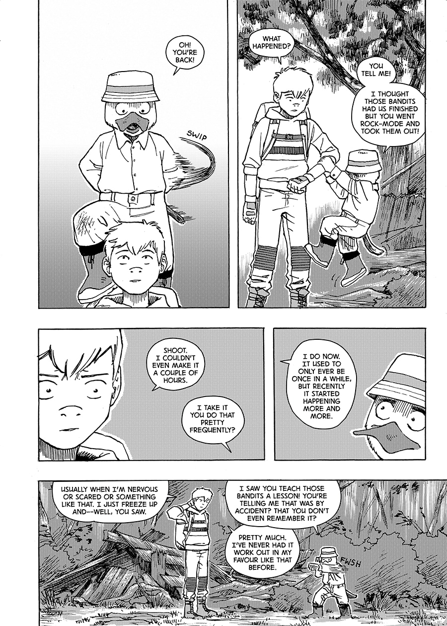 After touching an ancient stone figure on the outskirts of his hometown, 8-year-old Robin soon develops a strange affliction–When overcome with fear or anxiety, he turns to stone. 9 years later, Robin sets out on a journey to gain control of his condition, one fraught with absurd characters, surreal situations, and copious diversions.