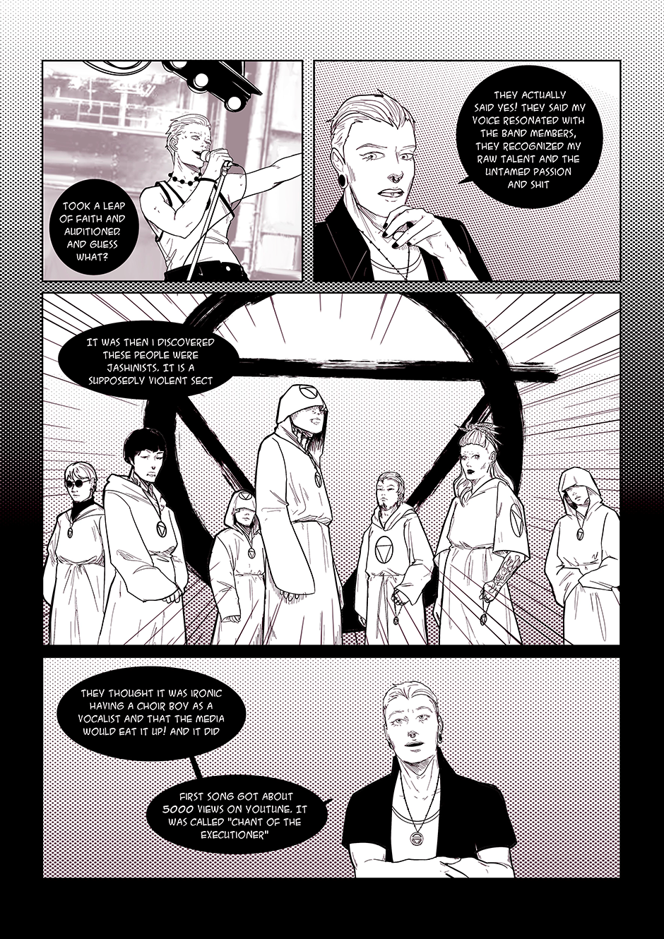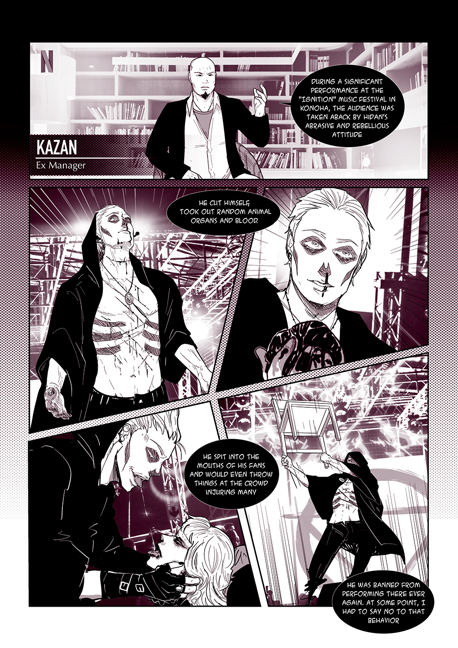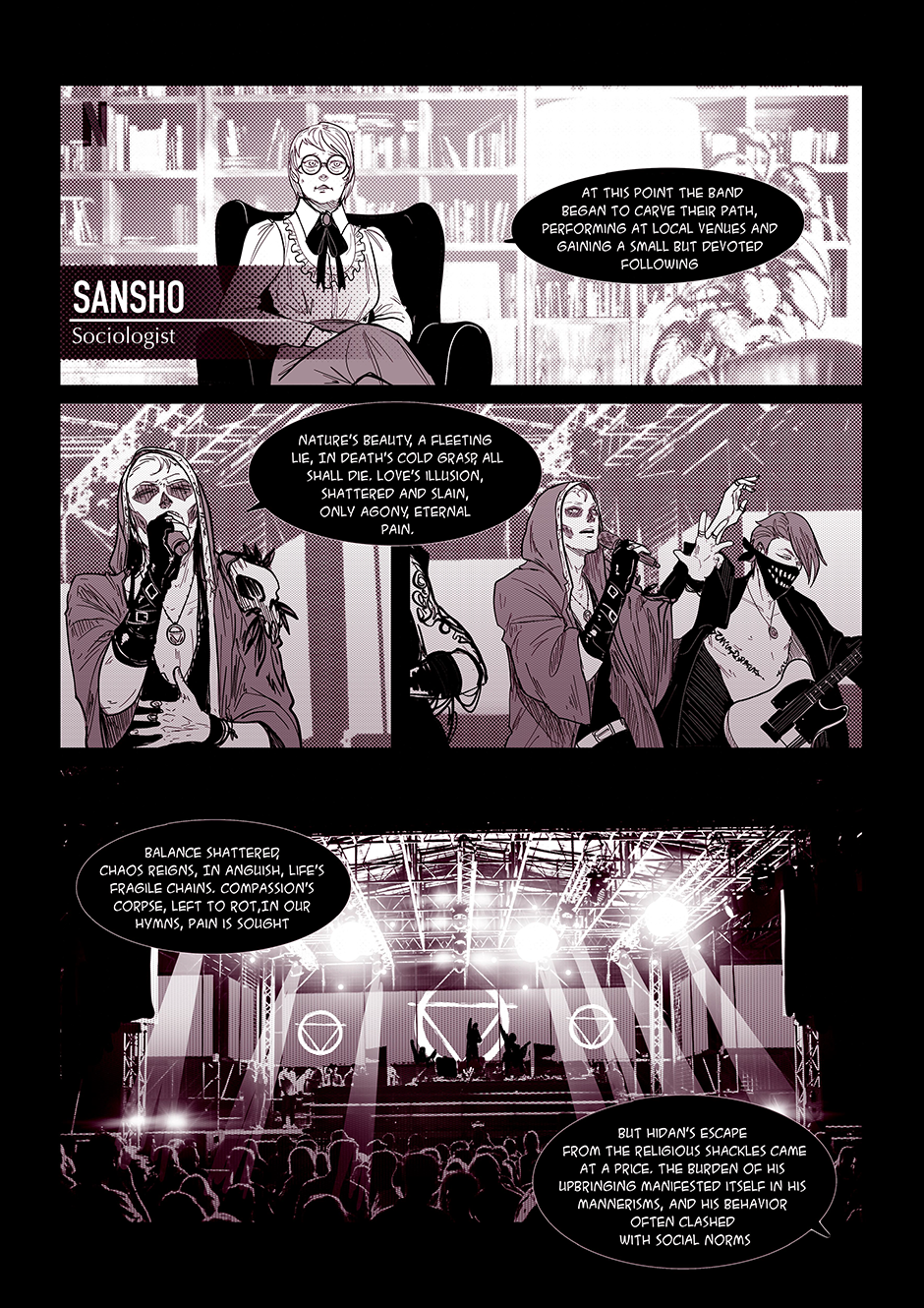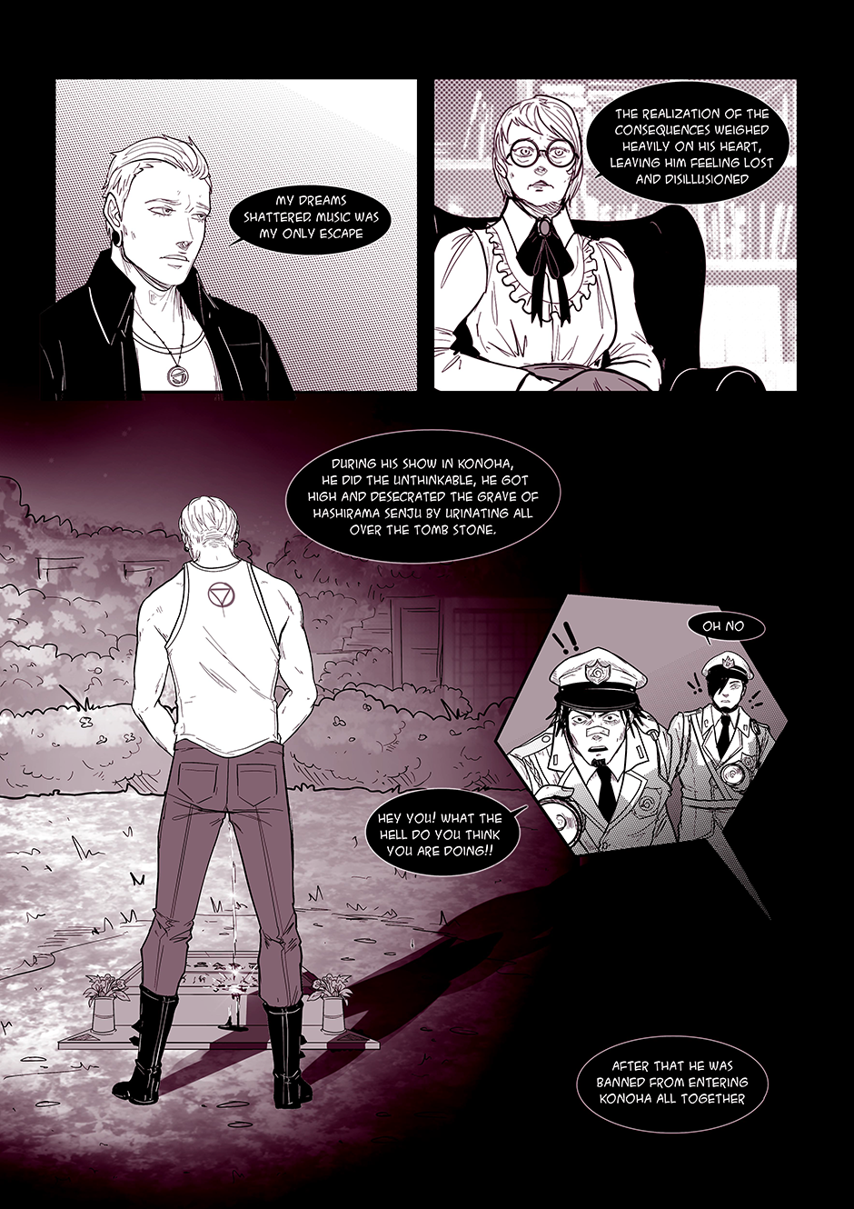 "Songs of the Damned" is a comic book that takes you on a wild ride through the chaotic world of a band called the 'Akatsuki' (based on the anime characters from Naruto). Behind the scenes of their electrifying performances and catchy tunes lies a labyrinth of personal struggles, haunted by past traumas, battles with addiction, and the haunting specter of abuse. But hold on tight, because this isn't your typical tale of woe. With a twisted sense of humor, the story unfolds as a dark comedy, weaving laughter and despair together in a devilishly entertaining symphony.