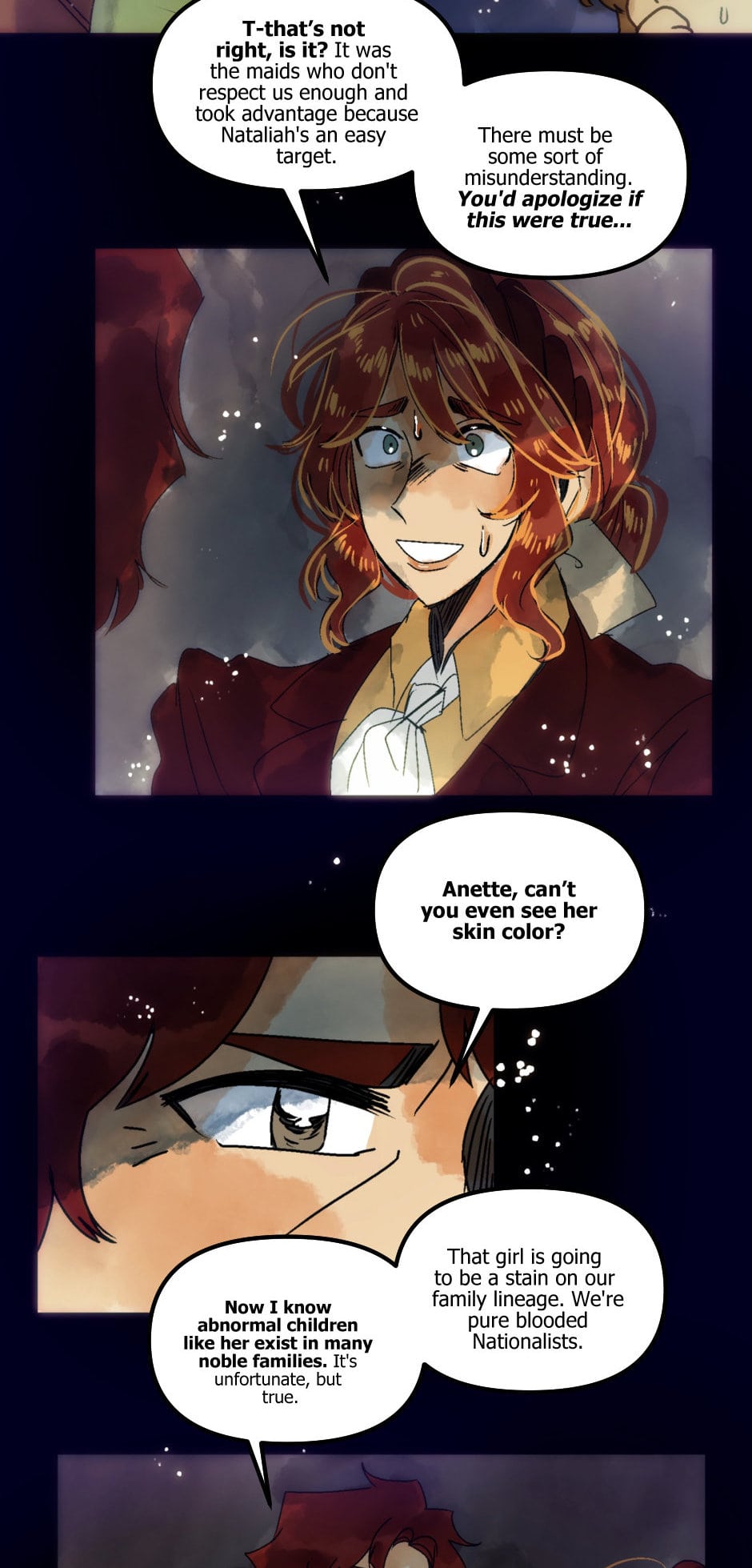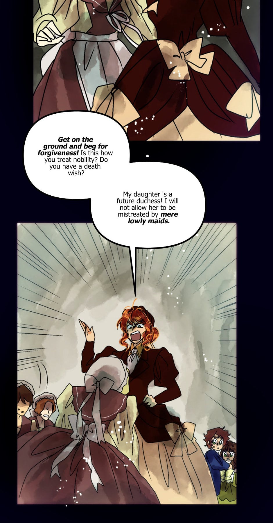 In these stories, when a maid abuses a noblewoman she is immediately demeaned and called lowly. Her status is the worst insult, not the abuse itself. In Villainess wants a Divorce, the MC is more concerned about being bullied by “lowly/mere maids” than the abuse itself. She alliances herself with the empress who orchestrated the abuse in the first place.