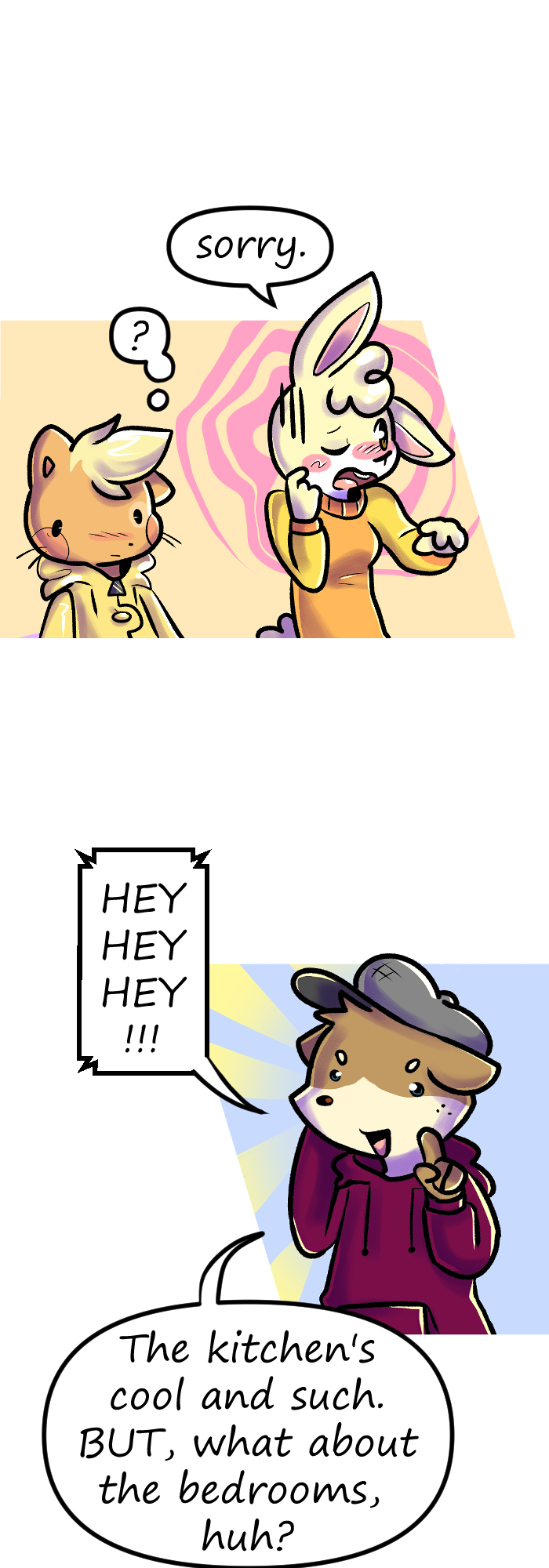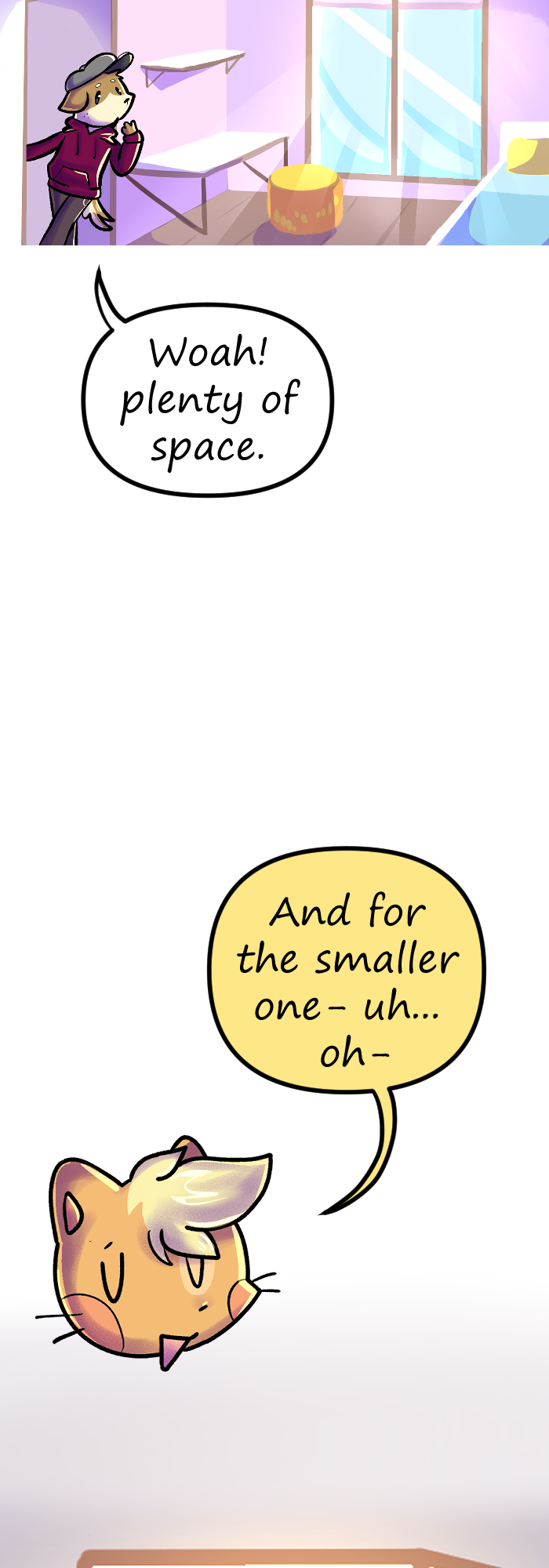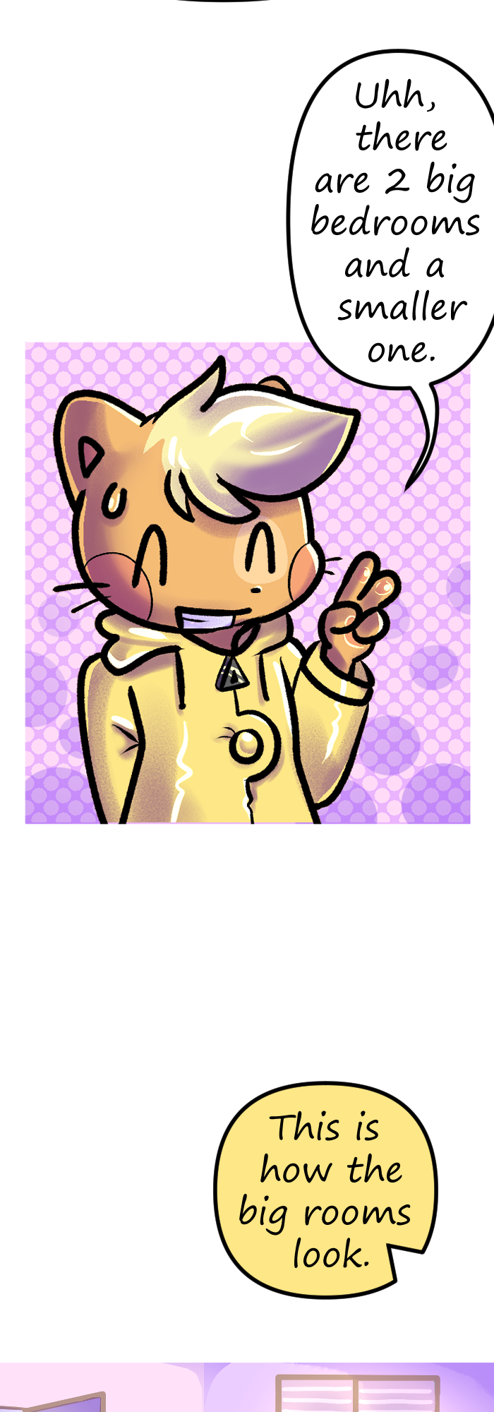 Thank you for reading episode number 2 of Floofkins! Next episode Floofkins, Wibble and Cotton will battle in a game of rock, paper and scissors to find out who will get a big room and who will get the small room. Who will lose? Find out in ep number 3!