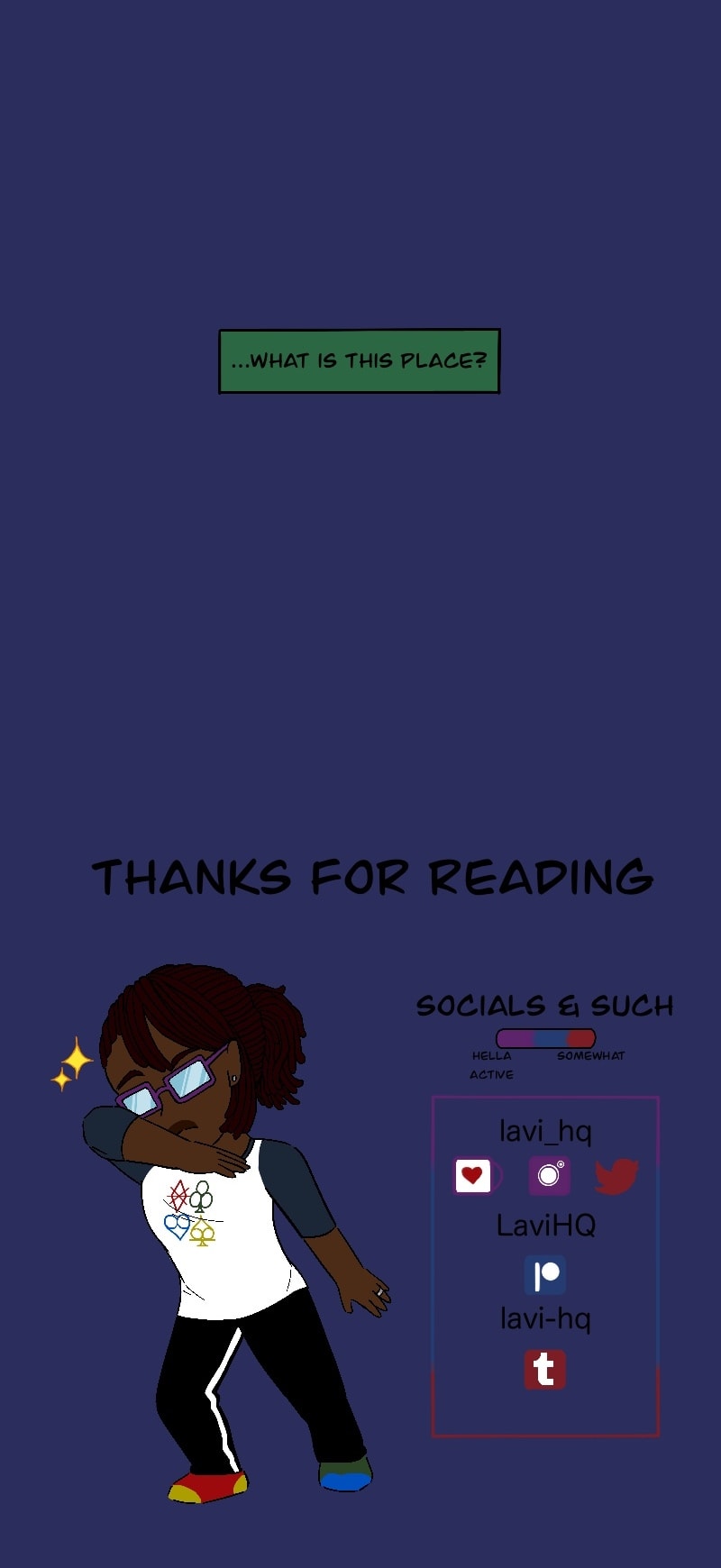 And there we have it folks!! The story will continue on Sept 9th once I come back with the start of Ep 4 and proceed to update 3times a month (9th, 19th, and the 27th). I'm pretty active on my socials so be sure to come and say hi or take a look at my Ko-fi and Patreon memberships if you're feeling curious. Got some good stuff in store, hope you'll be along for the ride~