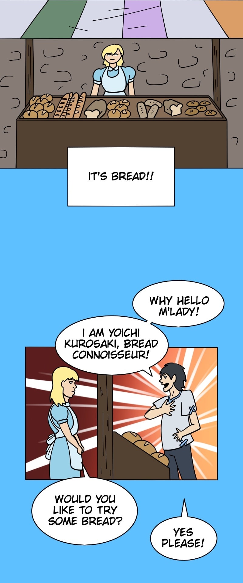 Yoichi Kurosaki is a lonely shut-in gamer who dreams of being transported to a fantasy world with magic and cute girls. One night a truck crashes through his house and kills him! Finally! He ends up in the presence of the Gods of Isekai who send him to a fantasy world with colorful creatures, magical powers, idiots, really good bread, and of course, an evil demon lord!