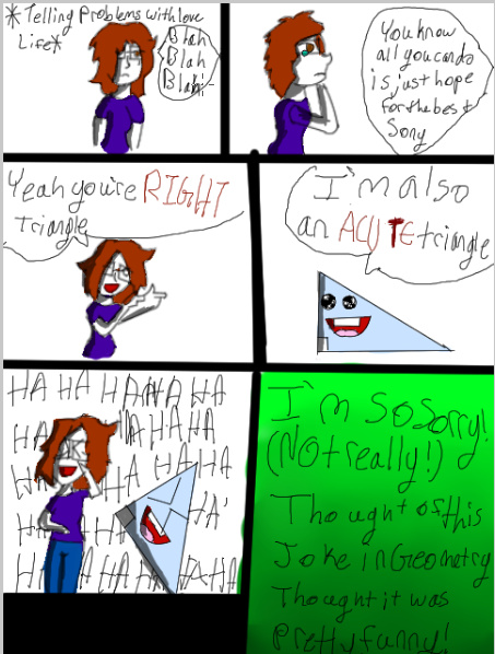 Ok so story time! There was a test in geometry and there were lots of right triangles and I thought of the best joke ever. I was half tempted to draw this comic on my test! (Glad I didn't) But! That's where I came up with this joke...Also my humor is silly! (If you couldn't tell)