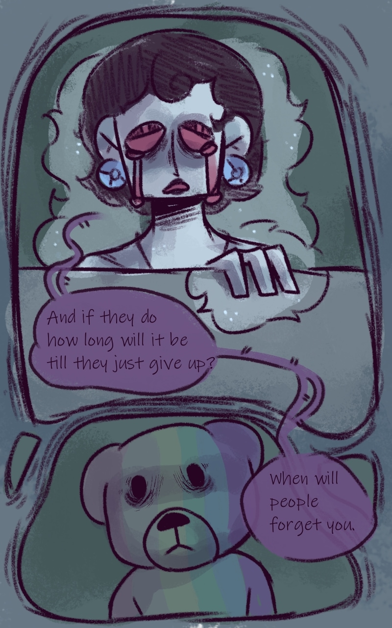 When I was younger, and scared of the dark, I was told that a teddy bear would protect me from the monsters of the night. Keep me safe. After that, I hugged my teddy and slept peacefully. I took him everywhere convinced he was the only thing I needed to keep me safe… I don’t blame him. After all, he was just a teddy. It’s alright Teddy. I Love you.