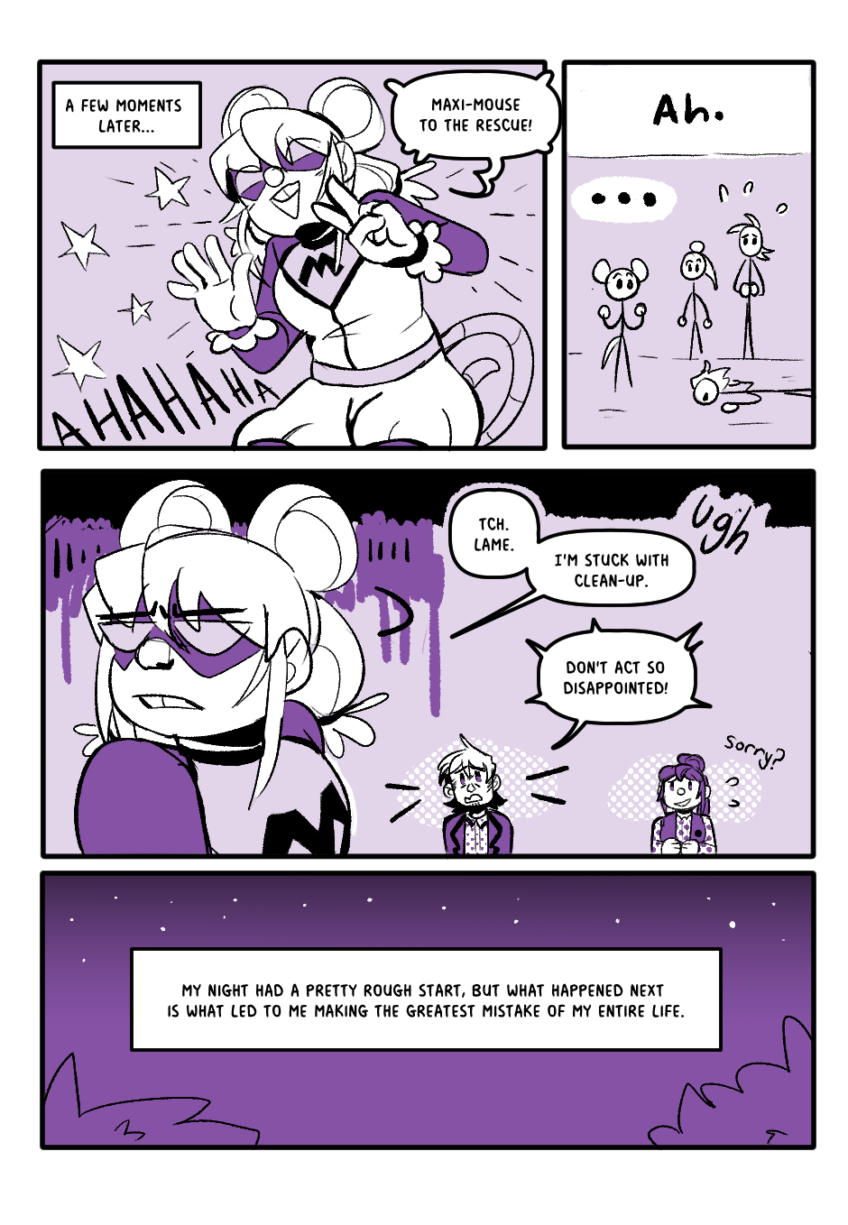 Part 2!!! I've got enough pages for one more part next week but after that ill be on an "I'll upload when I want" kind of schedule. But onto other news: I really enjoy Maxi-mouse's hair design but it does NOT make sense haha. And this mystery convenience store girl! What's her shtick huh? Hm...
