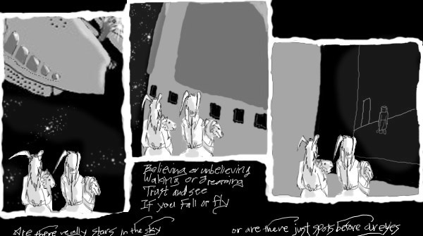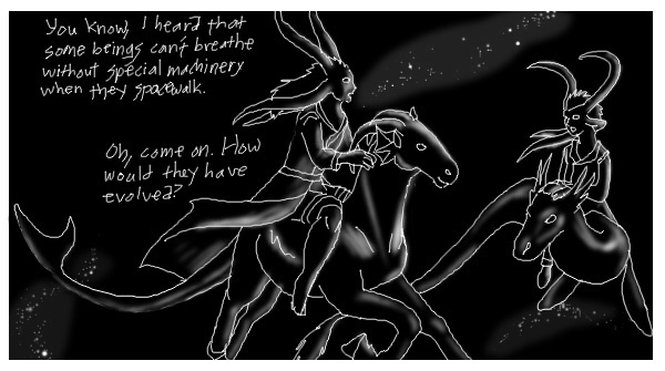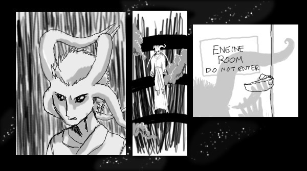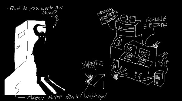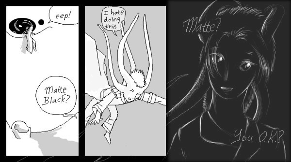 In 2001, when I was in high school, I made a "24 hour comic," meaning that I drew 24 complete comic pages in 24 consecutive hours, with no preparation beforehand, or changes afterward. This is Matte Black: Adventures in Monochrome, a soft science fiction adventure about aliens and spacecraft. Hand-painted in Photoshop. Reads left to right, top to bottom, like all my comics. I designed it to be viewed on a black background, with a lot of space around each page, but sadly, Tapastic doesn't seem to allow creators to control those features, does it?