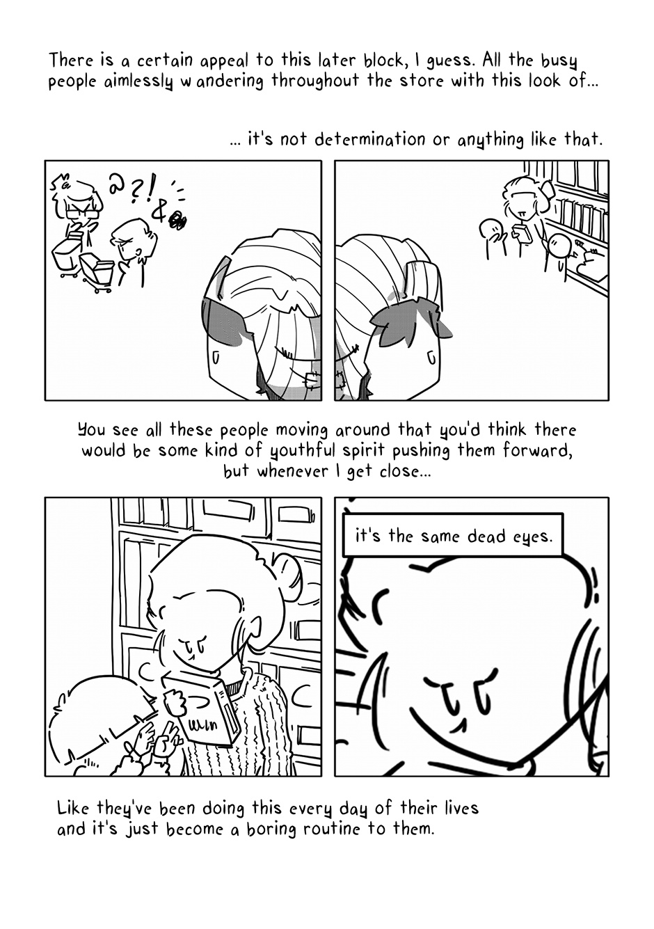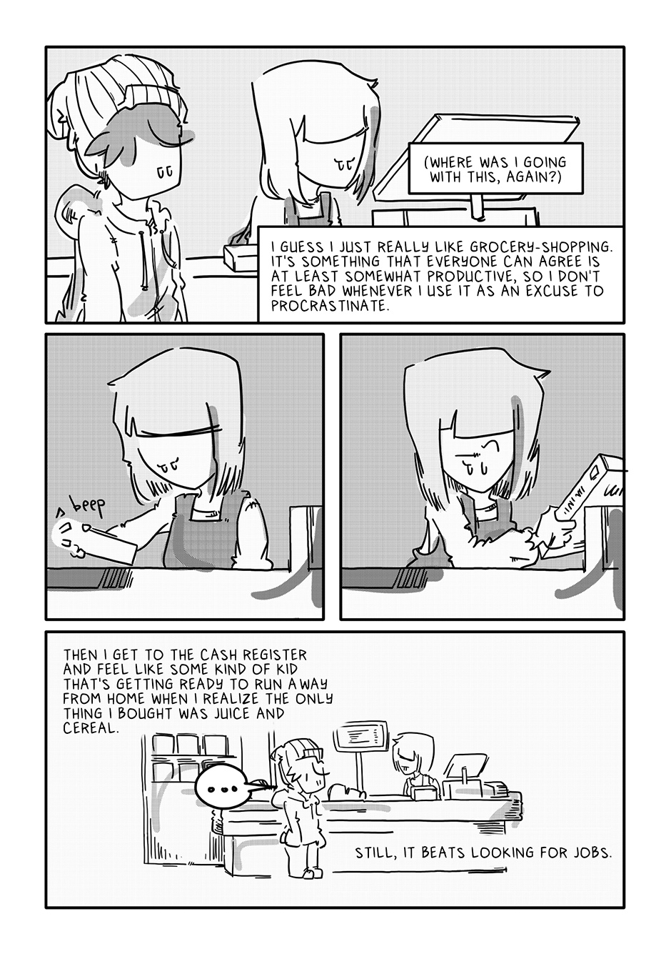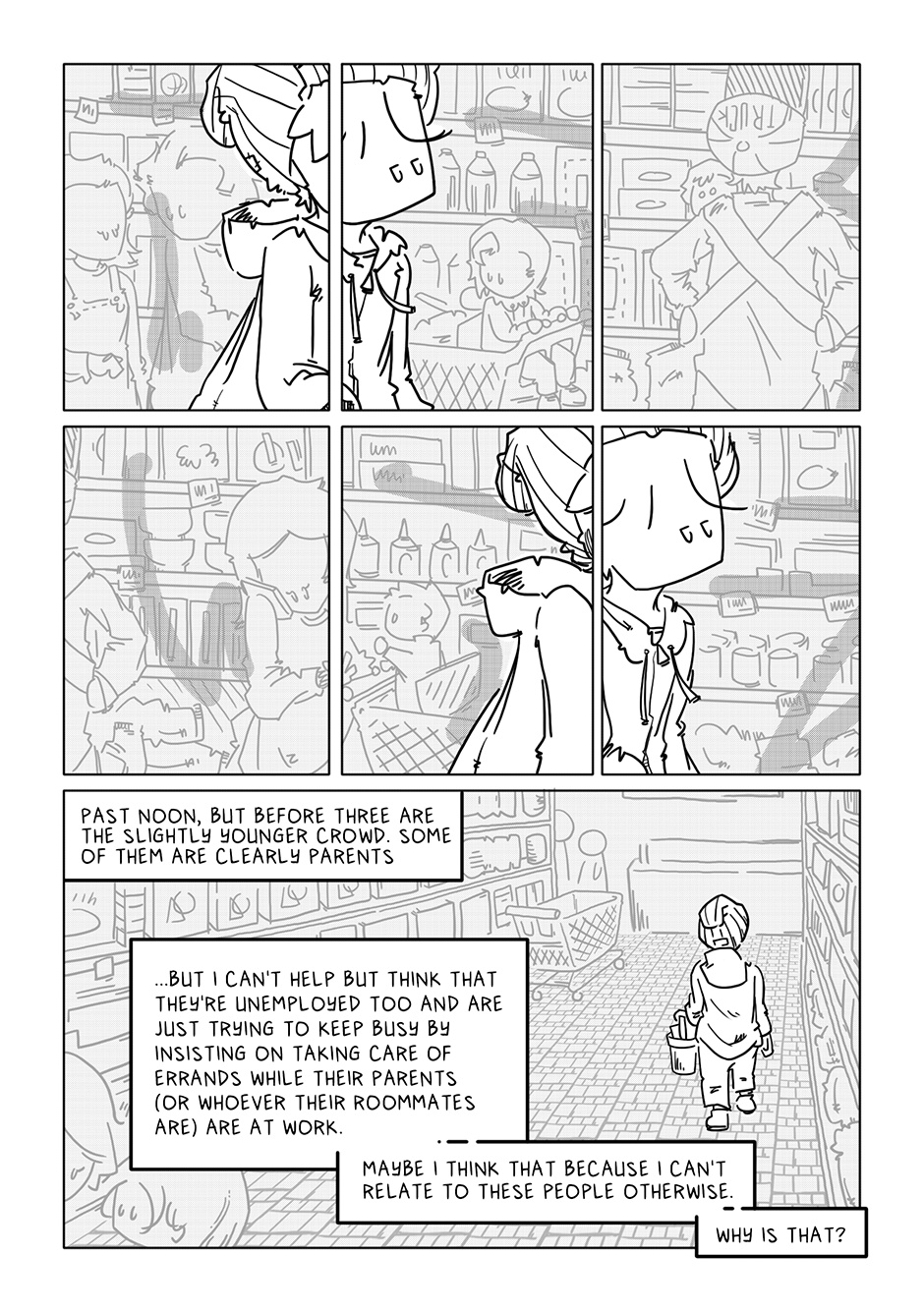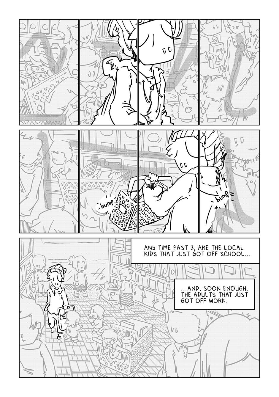 Lookit that sick horizontal panel layout! After just the initial rough of those pages, I concluded the rest of the comic could come out complete and utter crap and I’d still be proud of it if only for those panels of Boy walking through the aisles. For added fun, imagine Semisonic’s “Closing Time” playing over the store speakers.