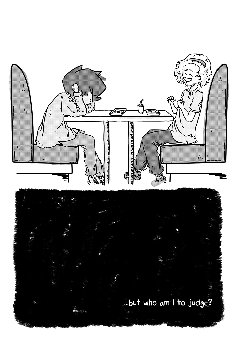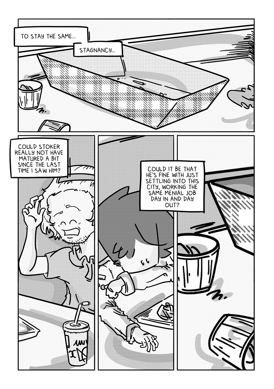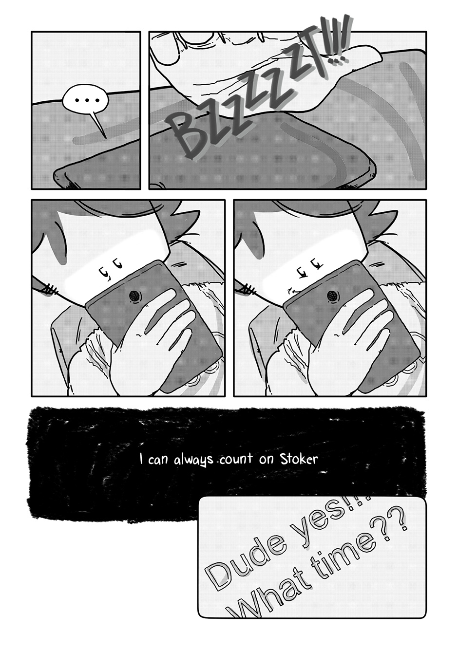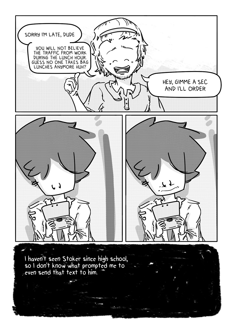 The first three chapters were such a bummer and I figured as long as I was getting Boy out of the house, I might as well throw him a bone somehow. Stoker was my response to that. Of all the characters in the story, he’s the only one I didn’t have a character design ready for when I got to roughing out his chapter. I figured something of a surfer bro (but not quite really!) look would fit a townie (well, “city-ie”) best.