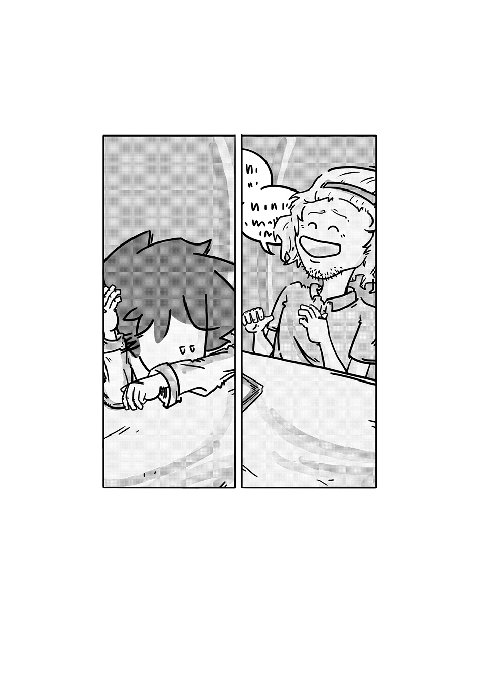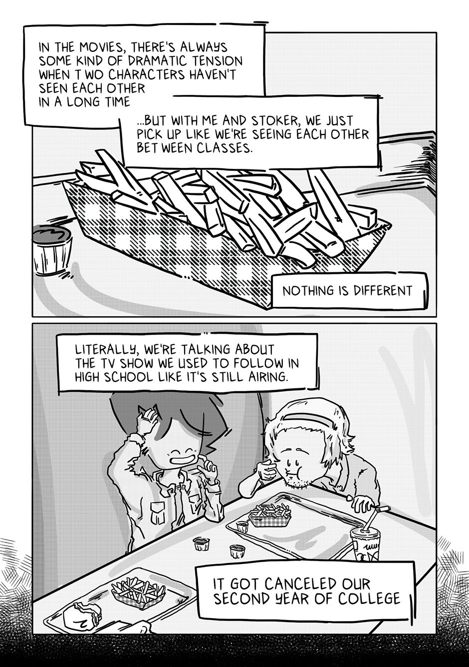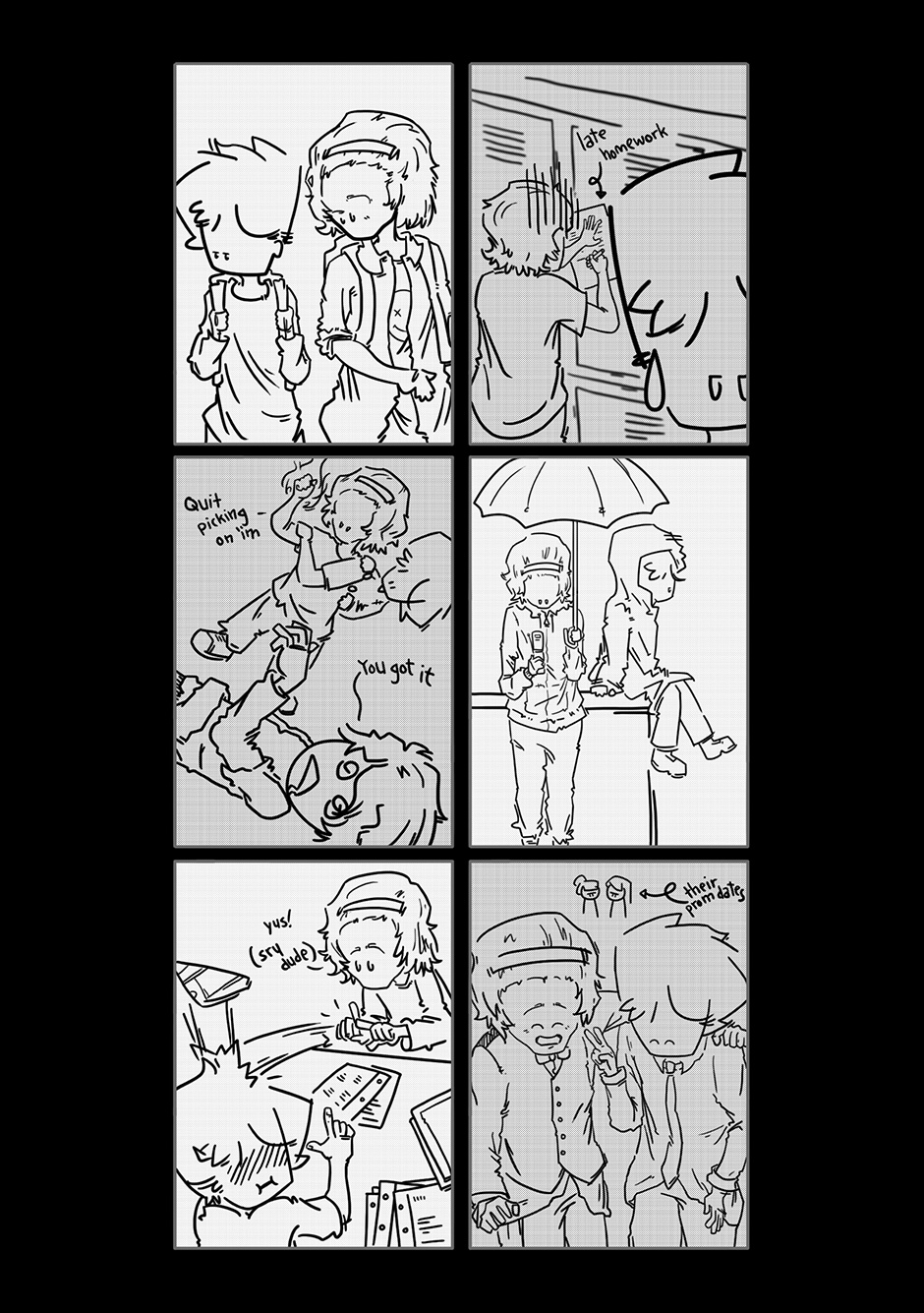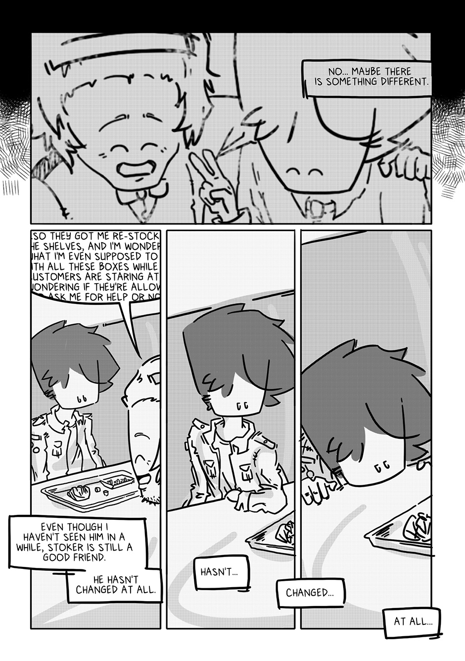 At first, I played with the idea of Stoker running into Boy by chance since older drafts had Stoker as less of a friend and more of that one classmate that ended up being in all your classes for the semester, so you ended up having an unlikely relationship that way, but that needed way too much setup. As is, flashbacks hint they weren’t the best of friends at first, but still became buddies over time, which I guess still works. I would like to have a story with a “prelim-Stoker/Boy” relationship sometime down the line, though.
