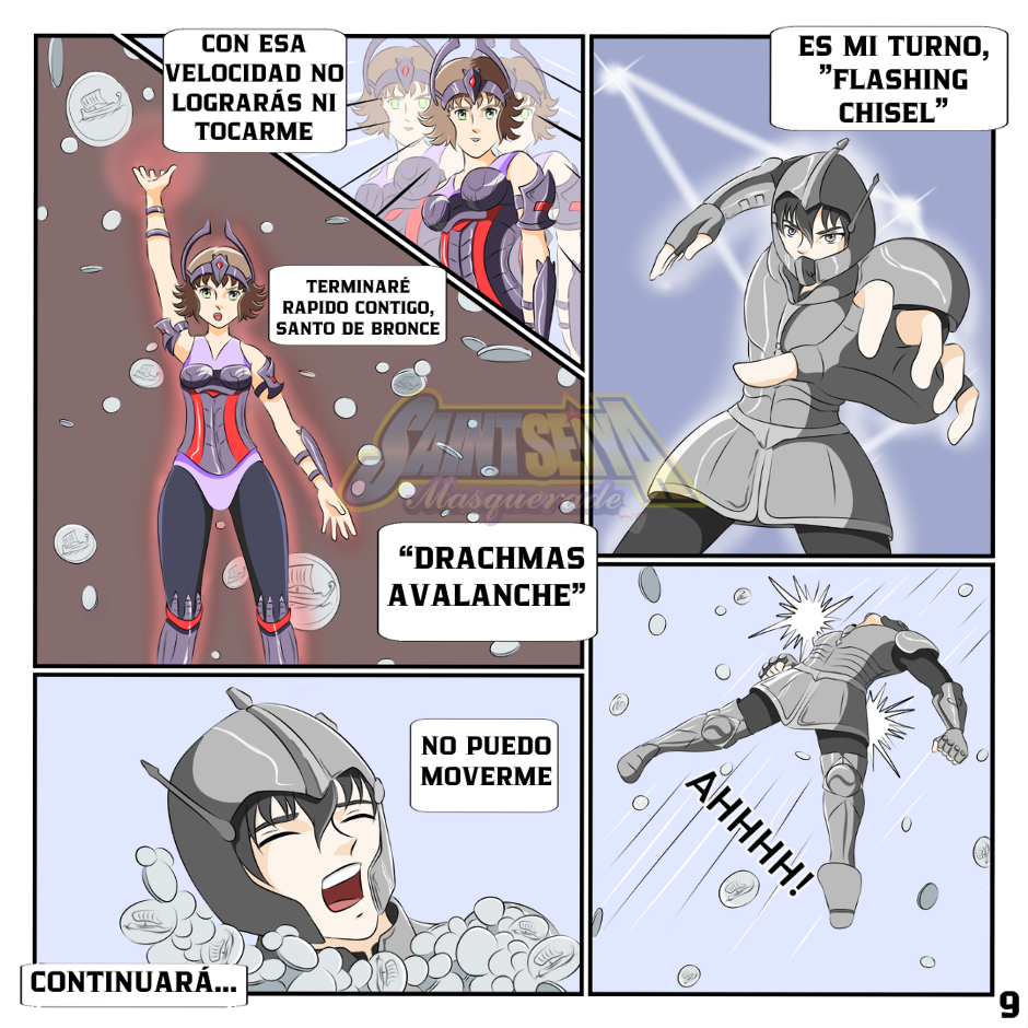 Empezaron las peleas! Y de qué forma! Acción por todas partes, Las avernales de Perséfone son bastante poderosas. Los Santos la van tener muy difícil para recuperar a Atena :/ Por cierto, muy interesantes las técnicas que planteas para los guerreros de ambos bandos.